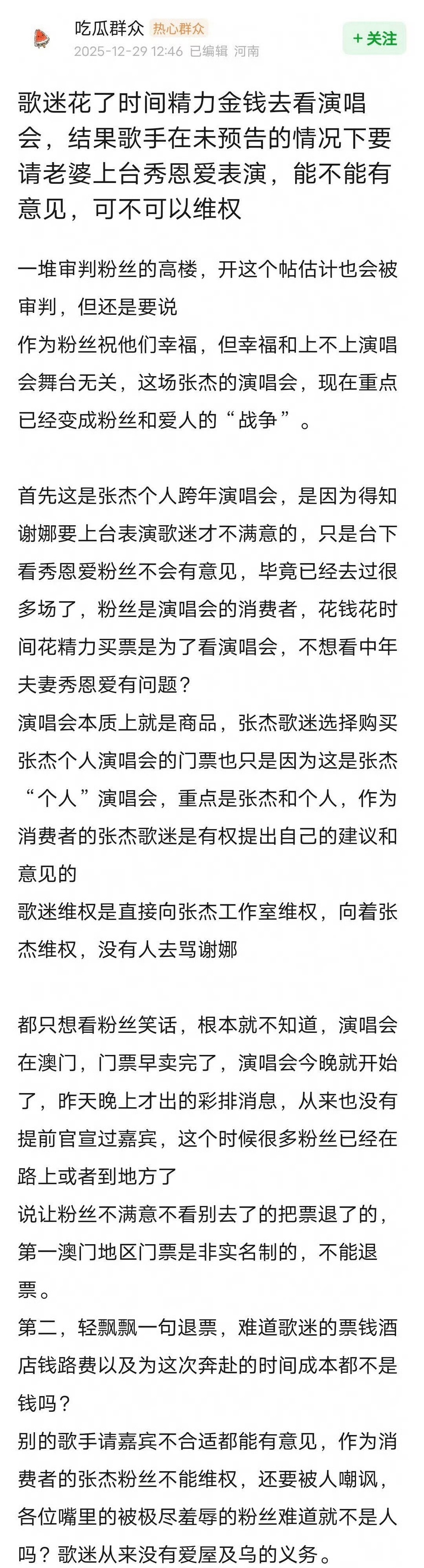 不过看这些评论我又觉得张杰粉丝说的也有道理,就是买谁的票只想看他一个人有啥错吗,这和歌手开演唱会当天晚上空降惊喜嘉宾,好像也不完全是一回事张杰工作室评论区张杰梦女