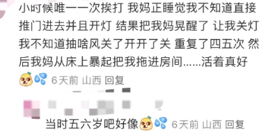 我妈正睡觉我不知道直接推门进去并且开灯 ,结果把我妈晃醒了,让我关灯我不知道抽啥风关了开开了关, 重复了四五次 ,然后我妈从床上暴起把我拖进房间......