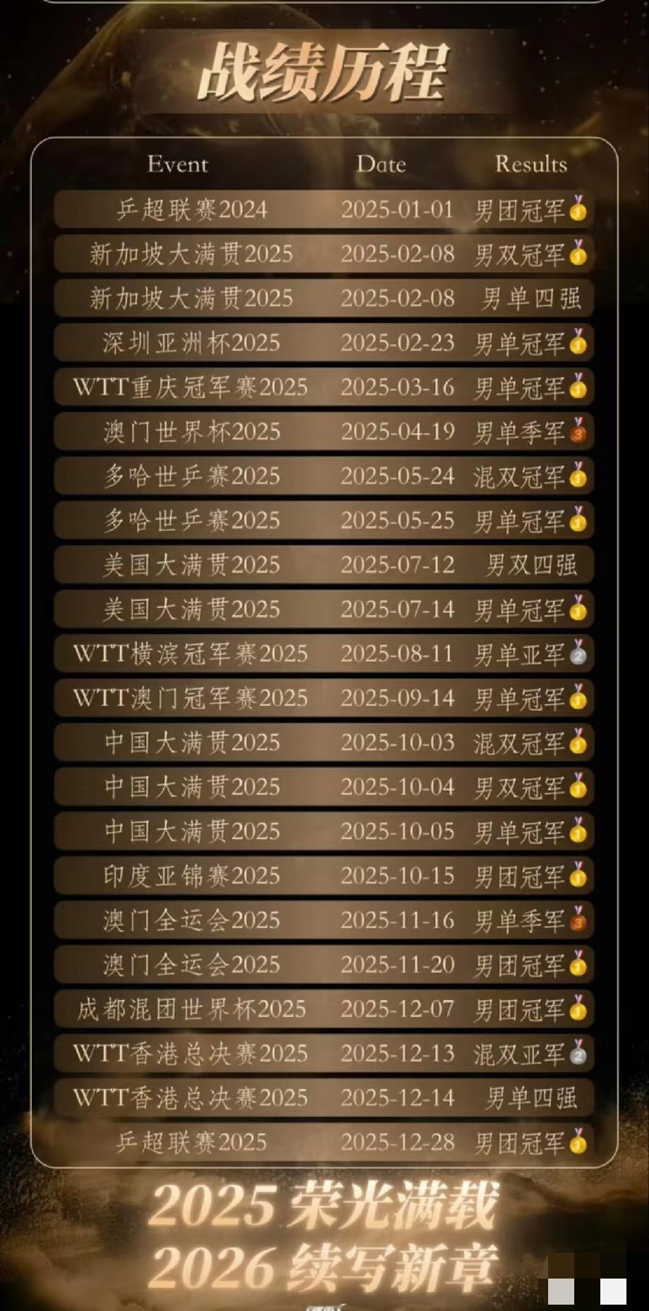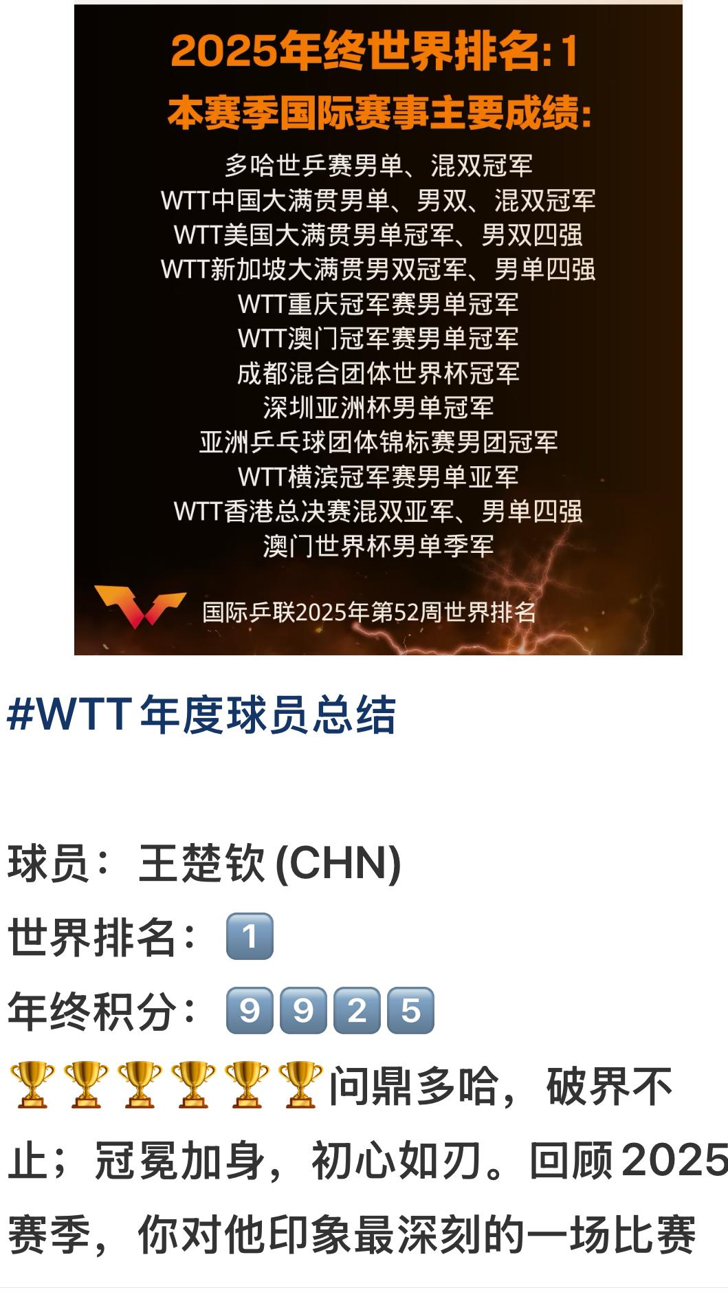 WTT世界乒联年度总结王楚钦—🏆问鼎多哈,破界不止, 冠冕加身,初心如刃! WTT对王楚钦的评价非常到位, 2025年度, 王楚钦一共夺得15个冠军🏆, 平均不到一个月一块金牌🎖️, 他是历史上首位在整赛季期间都打进 四强的选手, 首位左手将世乒赛男单冠军, 25岁的王楚钦, 站在站在光芒汇聚之处, 已经成为国乒的领军人物, 2025很好👍, 2026王楚钦会带领国乒队员们, 继续创造辉煌! 就像王楚钦总结自己的2025, 利大于弊,有收获有遗憾, 2026继续为国家,为团队, 为自己努力奋斗💪……
