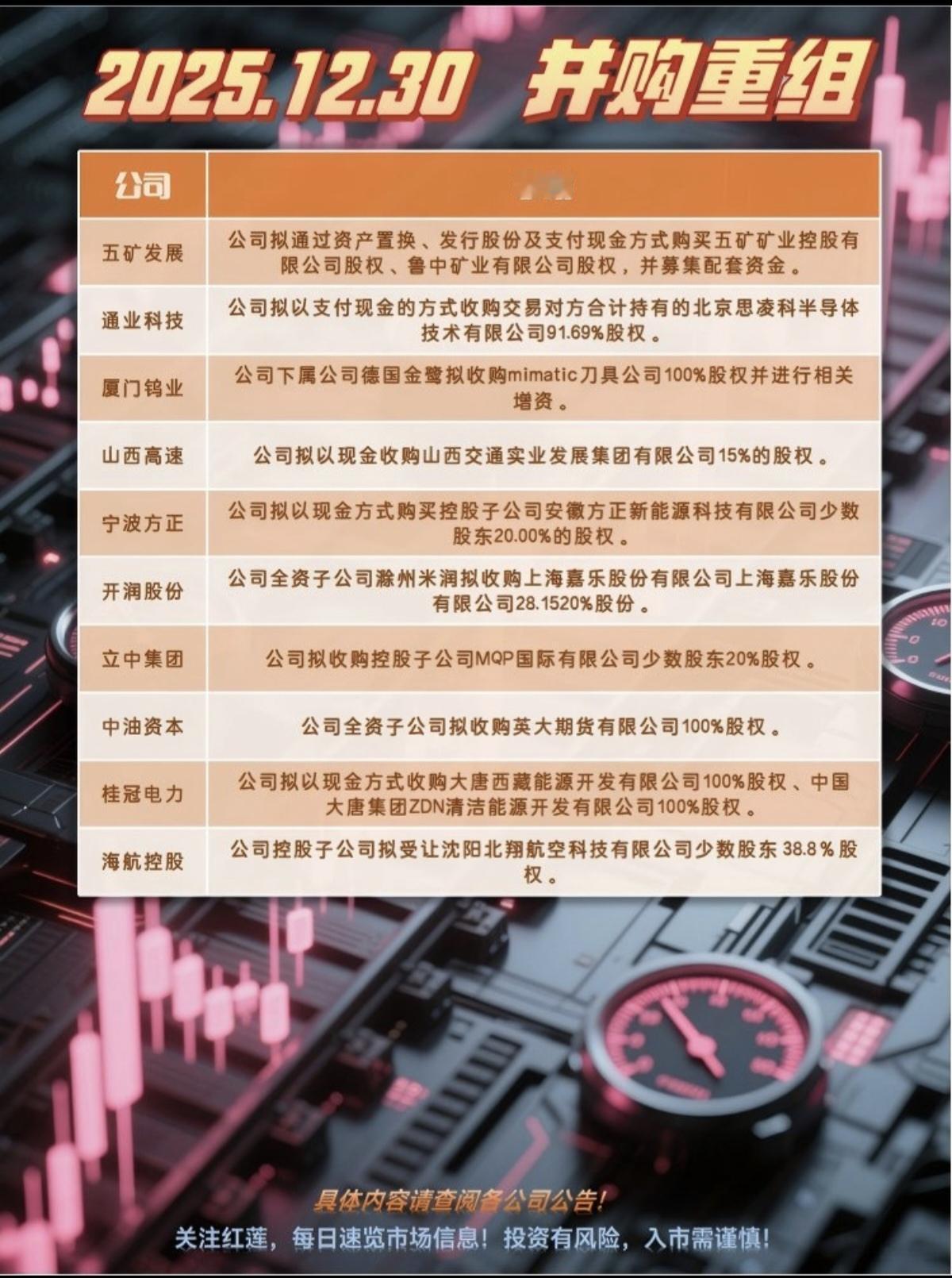 12.30周二 10家上市公司并购重组! 最新披露:10家上市公司并购重组。并购重组事项是高层推崇备至的战略规划。