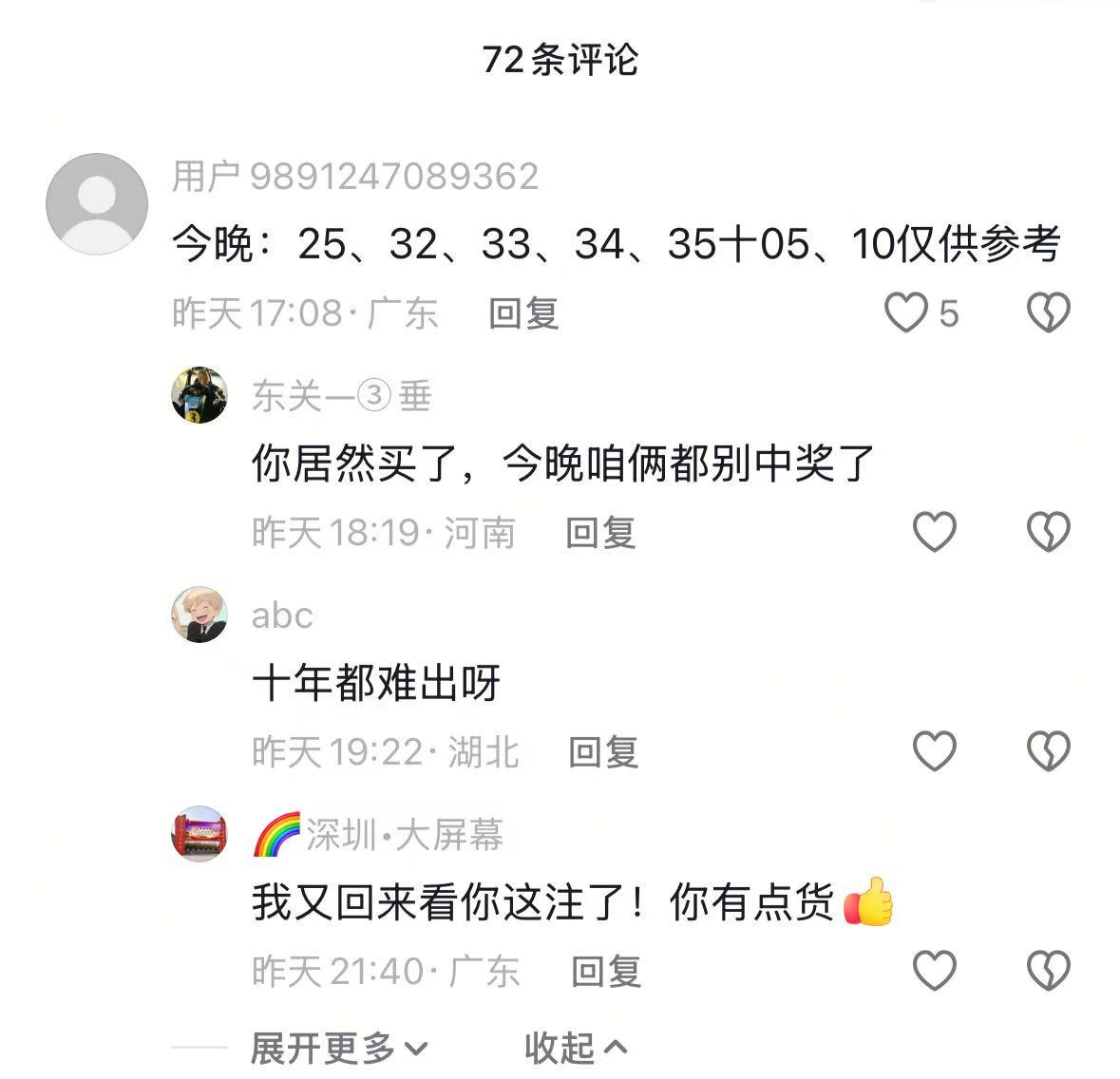 彩友开奖前4小时给出的号码很有水平:基本成功预判25左右超大龙头和30 31 32连号位置,只是稍稍有些偏差,后区的05 10和实际开出05 12也很接近,可惜彩友只凭借单挑就想全中难度实在太大,能做到位置大致准确尤其预判大号已相当了不起,如果当期合买团请了这位军师那就厉害啦!