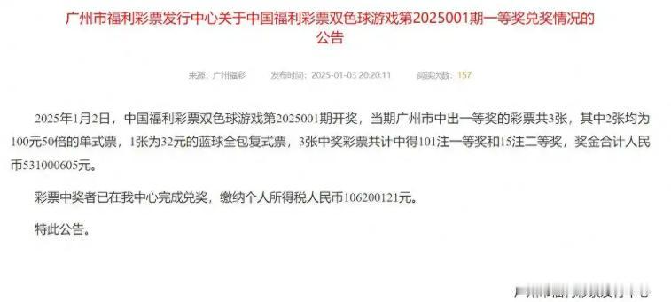 新年001期广东彩友独揽101注双色球头奖拿下5.3亿巨奖,成功跻身彩票史上前五大巨奖创造历史,税后到手4.2亿元成功逆天改命[赞][赞]如今2025最后一期就要开奖,收官战马上打响,眼瞅着一年轮回又回到原点,不知道能否呼应5.3亿巨奖也来个大奖呢?[大笑][大笑]