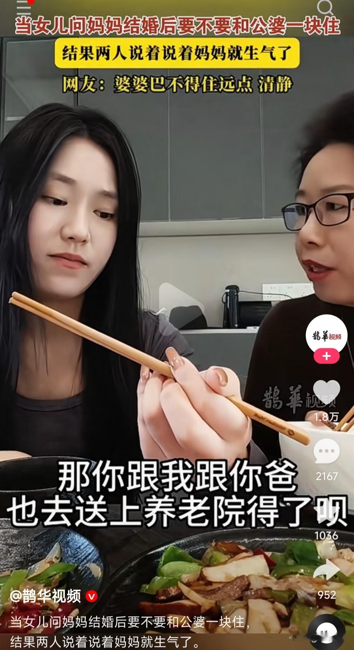 如此三观正的丈母娘谁遇到就是祖上积德了! 当女儿问妈妈结婚后要不要和公婆一起住,两人说着说着妈妈就生气了,当场来一句要不你把我跟你爸送养老院得了! 这种结婚后不愿和公婆一起住的人到底是怎么想的,宁愿给公婆在外面租房子住也不要他们一起,话说房子不是还有公婆的一份吗,她意思是就是不在一起住,吃饭的时候还是一起吃,这和走亲戚有什么区别,换位思考一下时间久了自己是不是也就烦了,爱屋及乌这个道理难道她就不懂吗,得亏这当妈的是个明事理的人,女儿的想法不也是再说自己父母吗,她直接来一句要不把她和她爸送养老院去,这当娘的直接怼的女儿无话可说,气的她妈连饭都不吃了。 如此三观正的丈母娘那个小伙遇到肯定是上辈子祖上积德了,老话说娶妻先看娘,尽管这女子不懂事,但她娘是个明事人,这娶进门日后肯定是个过日子的。