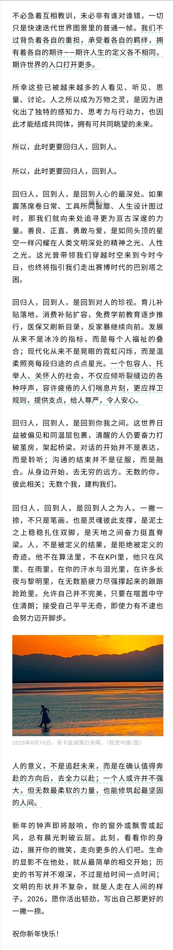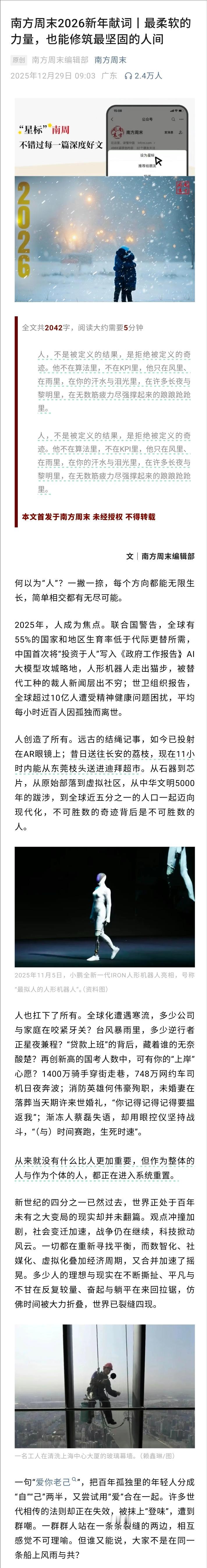 辉煌不再的《南方周末》,一年当中最让人期待的,恐怕也只有她的新年献辞了。这是属于她的荣耀,同样也是一种不体面的尴尬。通过献辞让大家还记住她,这一定不是《南方周末》的初衷,而是她的苦楚。 近些年,《南方周末》的献辞不再像以前那样能够引起大家的共鸣,反倒是批评多了起来,很多人批评她不再锋芒,也开始说面汤话了,从冷静理智深刻一步步走向了无病呻吟似的鸡汤文,已经失去《南方周末》原有的骨血,再也熬不出让人回味无穷的高汤。 《南方周末》确实变了,但变化的岂止是她吗?和《南方周末》的变化相比,其实人心变化更快。28年之前,人们还有静心认真的品读一些文章,但在今天,短视频的奶头乐让人欲罢不能,点开文章标题,能完整的看完一两段都算有耐心了。 当你对文字失去耐心的时候,再好的文章都是无力的。我们可以扪心自问,和28年之前相比,你今年完整的看过几本书? 奶头乐的逻辑就是两个字“量变”,今天我吃了一勺糖,感觉到了甜蜜,但用不了几天就寡淡了,然后加到两勺,再寡淡再加量,如此反复,也就渐渐失去了味觉,你一边不停的在加量,却要一边在埋怨现在的糖怎么越来越不甜了。 我看了《南方周末》2026年的新年献辞,我不认为有失水准,只是和20多年前相比,有些措辞有了更巧妙的表达方式,能够感觉到作者对每一个的斟酌和小心,以前可以直接撞击心灵,但现在要在抚摸中轻轻的碰一下,即便这,依然有人感觉被冒犯。 现在的人,强大又脆弱。 很多人急于批评《南方周末》的新年献辞,但这些批评者,有几人认真读完这两千字呢?草草了了,一扫而过,然后就开始教南周做人了。 南周今年的献辞,回归到了人这个最基本的概念。 在人人都喜欢宏大叙事的今天,有几人能够真正考虑到人,考虑到身边的你我他,言必称国际,张嘴闭嘴谈的都是世界局势,把情怀道德挂在喜马拉雅,却极少有人真正关心自己、关心身边的人。 就像南周献辞中说的:回归人,回到人,是回到对人的珍视。育儿补贴落地,消费补贴扩容,免费学前教育逐步推行,医保又刷新目录,反家暴继续向前。这些,才是看得见摸得着,对我们最有体感的真实。 乌克兰的弹片,和巴勒斯坦上空的火箭弹,还不如我们锅里的一滴油。 回归人,回到人,是回到人之为人。一撇一捺,不只是笔画,也是灵魂彼此支撑,是泥土之上稳稳扎住双脚,是天地之间奋力挺直脊梁。 人的意义,不是追赶未来,而是在确认值得奔赴的方向后,去全力以赴;一个人或许并不强大,但无数最柔软的力量,也能修筑起最坚固的人间。