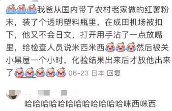 我爸从国内带了农村老家做的红薯粉末,装了个透明塑料瓶里,在成田机场被扣下,他又不会日文,打开用手沾了一点放嘴里,给检查人员说米西米西,然后被关小黑屋一个小时,化验结果出来后才放他出来了