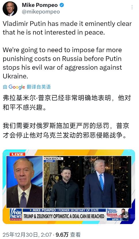 美国前国务卿蓬佩奥今天(北京时间12月30日)发文写道:“弗拉基米尔·普京已经非常明确地表明,他对和平不感兴趣。我们需要对俄罗斯施加更严厉的惩罚,普京才会停止他对乌克兰发动的邪恶侵略战争。” 看到这则表态,不少人第一反应都是“老调重弹”。毕竟这几年,美国政客拿俄乌冲突做文章、把责任全推给俄罗斯的言论,大家已经听了太多。 但蓬佩奥选在12月30日这个时间点再度发声,绝非单纯的情绪宣泄,背后藏着的立场和算盘,得拆开来捋清楚才明白。 首先要明确一个基本事实,蓬佩奥口中“普京对和平不感兴趣”的说法,根本站不住脚。俄乌冲突已经进入第四个年头,国际社会推动和平谈判的努力从未停止,联合国多次通过决议呼吁停火止战,中国、印度、巴西等众多国家也一直主张政治解决争端。 就在12月下旬,国际社会针对俄乌冲突的和平谈判还在推进,只是因为双方在领土和安全保障等核心问题上的分歧未能弥合,才导致进展有限。 俄罗斯方面也并非没有释放和平信号。俄罗斯总统普京此前就曾表态,若乌克兰有意和平,俄方愿意通过谈判解决问题,只是俄方认为乌克兰当前的立场并不具备和平谈判的基础。反观蓬佩奥所在的美国阵营,一边喊着“和平”口号,一边却在不断给冲突“拱火”。 2025年1月,美国就曾宣布对俄罗斯能源领域实施新一轮制裁,制裁范围覆盖俄大型油气企业、运油船队、油田服务提供商等多个领域。截至目前,针对俄罗斯个人和实体的制裁已经高达28595项,这个数字比其他所有国家遭受的制裁总和还要多。 更值得注意的是,美国对俄制裁的态度本身就充满矛盾。今年4月,美国最新关税名单中并未列入俄罗斯,白宫给出的理由是“正在与俄罗斯谈判以解决乌克兰冲突,不想将关税问题与和平谈判混为一谈”,甚至称这一做法是为了“挽救生命”。 短短几个月后,蓬佩奥又跳出来呼吁“更严厉的惩罚”,这种前后不一的表态,足以说明美国所谓的“制裁”和“和平”,本质上都是服务于自身地缘政治利益的工具。 蓬佩奥把俄罗斯的军事行动定性为“邪恶侵略战争”,这种说法也完全忽视了冲突的历史经纬和现实背景。 俄乌冲突的爆发有着复杂的历史渊源和安全因素,北约持续东扩是重要背景之一。俄罗斯的安全关切长期得不到重视和解决,这才是冲突爆发的重要根源,简单将其定性为“侵略”,显然是片面且不客观的。 从当前的战场形势来看,加码制裁也根本解决不了问题。联合国难民署12月发布的报告显示,截至2025年9月,全球记录在册的乌克兰难民已达575万人,其中约520万人在欧洲,乌克兰境内的流离失所者更是高达375万人,超过1270万乌克兰民众需要人道主义援助。 2025年以来,战场局势持续升级,俄罗斯武装力量对乌克兰关键基础设施的空袭明显增加,导致大面积停电停水,当地民众的生活处境愈发艰难,尤其是在即将到来的寒冬季节,人道主义危机还在不断加深。 国际社会的普遍共识是,制裁从来不是解决冲突的有效途径。美国此前对俄实施的多轮制裁,不仅没有达到预期效果,反而引发了一系列连锁反应。 2022年能源领域的制裁,就导致美国国内油价大幅上涨;美国企业因制裁关闭在俄业务后,还出现了产能不足、供应链断裂等问题,最终损害的还是美国自身的经济利益。 欧盟今年将对俄制裁延长至2026年年中,但从实际效果来看,欧盟与俄罗斯的双边紧张指数虽处于高位,却已出现缓和迹象,制裁的威慑力正在逐渐减弱。 再回到蓬佩奥本人的身份,作为美国前国务卿,他的言论虽然不代表当前美国政府的官方立场,但却反映出美国国内部分保守势力的态度。 临近年末,美国国内政治局势复杂,俄乌冲突作为重要的外交议题,一直是不同派系博弈的焦点。蓬佩奥此时发声,大概率也是为了迎合自身阵营的诉求,刷取政治存在感。 说到底,解决俄乌冲突的唯一可行途径,还是回到谈判桌前。各方都应该保持克制,停止火上浇油的行为,尊重各国的主权、独立和领土完整,同时也重视各国的合理安全关切。蓬佩奥这种“加码制裁”的呼吁,只会让冲突进一步升级,让更多民众承受战争之苦,完全不符合国际社会的共同利益。 国际社会需要的是更多推动和平的努力,而不是制造对立的言论。希望各方都能拿出诚意,积极响应联合国的停火呼吁,为政治解决争端创造有利条件,这才是真正对乌克兰民众、对俄罗斯民众,也是对全球和平与稳定负责。