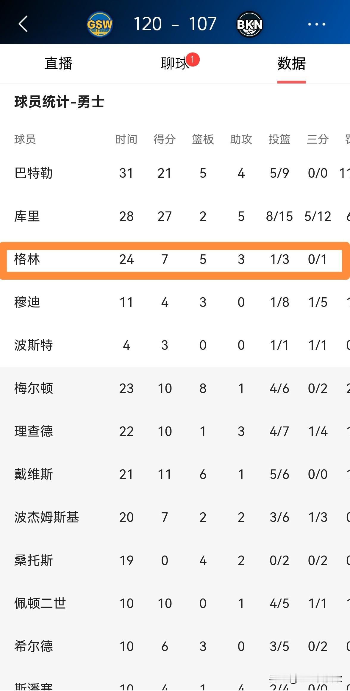 勇士老将追梦格林又躺赢了!在今天勇士客场以120:107大胜篮网的比赛中,追梦格林首发出战24分钟,投篮3中1,其中罚球6中5得到7分5篮板3助攻1抢断,出现了5次犯规,他的场上正负值为+3。 由于本场比赛勇士是背靠背作战,因此追梦格林显得有些疲惫,他在场上的斗志并不旺盛。