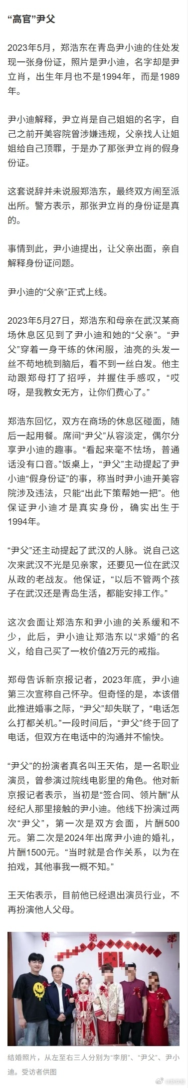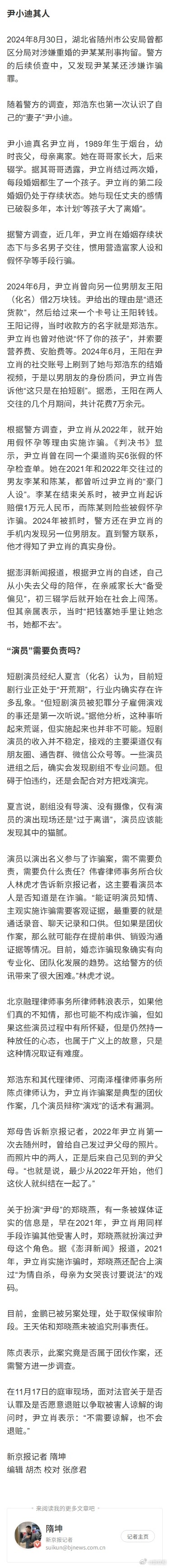 #许我耀眼现实版骗婚案#【扮演“豪门父母”卷入骗婚案,演员需要担责吗?】据新京报报道,2025年12月8日,湖北省随州市曾都区人民法院审理了一起骗婚案,化名尹小迪的被告人尹立肖犯诈骗罪,被判处有期徒刑四年六个月,并处罚金两万元;继续追缴尹立肖违法所得89140元,发还给被害人。此后尹立肖提出上诉,案件进入二审程序。在庭审中,法院认定尹立肖雇请假父母、哥哥骗取被害人信任,骗取巨额财物的事实。被骗的当事人郑浩东(化名)告诉新京报记者,与尹立肖开始交往起,对方即虚构称其父亲是厅局级干部,母亲是模特。并花钱雇请短剧演员扮演其父母、雇请情感主播扮演其哥哥。他坚持认为,尹立肖不仅是职业婚骗,还组织短剧演员参与了团伙作案。据了解,尹某某花钱雇来的“父母”未被追究刑责。其“哥哥”扮演者目前另案处理。12月23日,新京报记者拨通了“尹父”王天佑的电话。据他称,当初自己是从经纪人那接到的“戏”,仅知道尹小迪需要付费找人扮演自己的父亲,其他情况一概不知。某短剧演员告诉记者,平时通告群里经常看见类似不进组的演员招聘,“比如谁过年回家为了应付父母催婚,会雇用临时恋人。也有的雇佣临时父母,一些演员也会接这类演出。”一场酷似热播剧《许我耀眼》中桥段的骗局背后,是法律中的新问题。有法律专家表示,类似演出一旦涉及刑事案件,演员是否属于从犯,仍然存在争议。