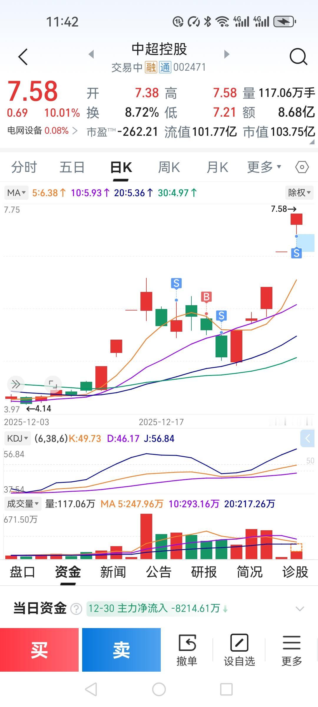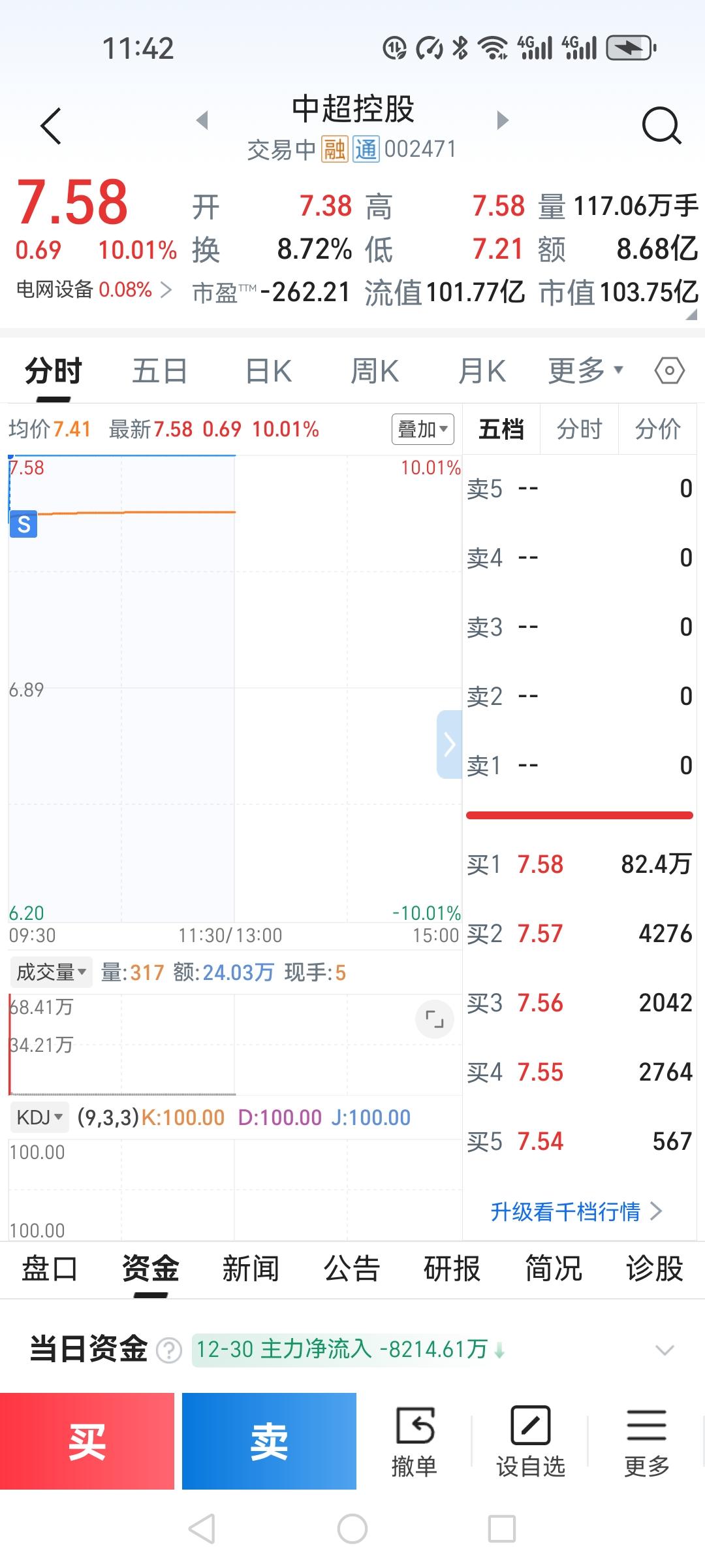 中超控股又涨停了! 中超控股7.38开盘,下摸7.21转头就冲上了涨停,死死地封在涨停上。已连续3个涨停板了,我担心明天会回调。这个庄的手法我是领教过了,要不涨停然后就来个跌停板,所以我今天先卖了,落袋为安,明天看看能不能回调,回调时买回来。 你们买过中超控股吗?你们是怎么操作的,谈谈你们的经验。