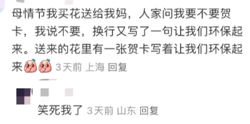 我买花送给我妈,人家问我要不要贺卡,我说不要,换行又写了一句让我们环保起来。送来的花里有一张贺卡写着让我们环保起来