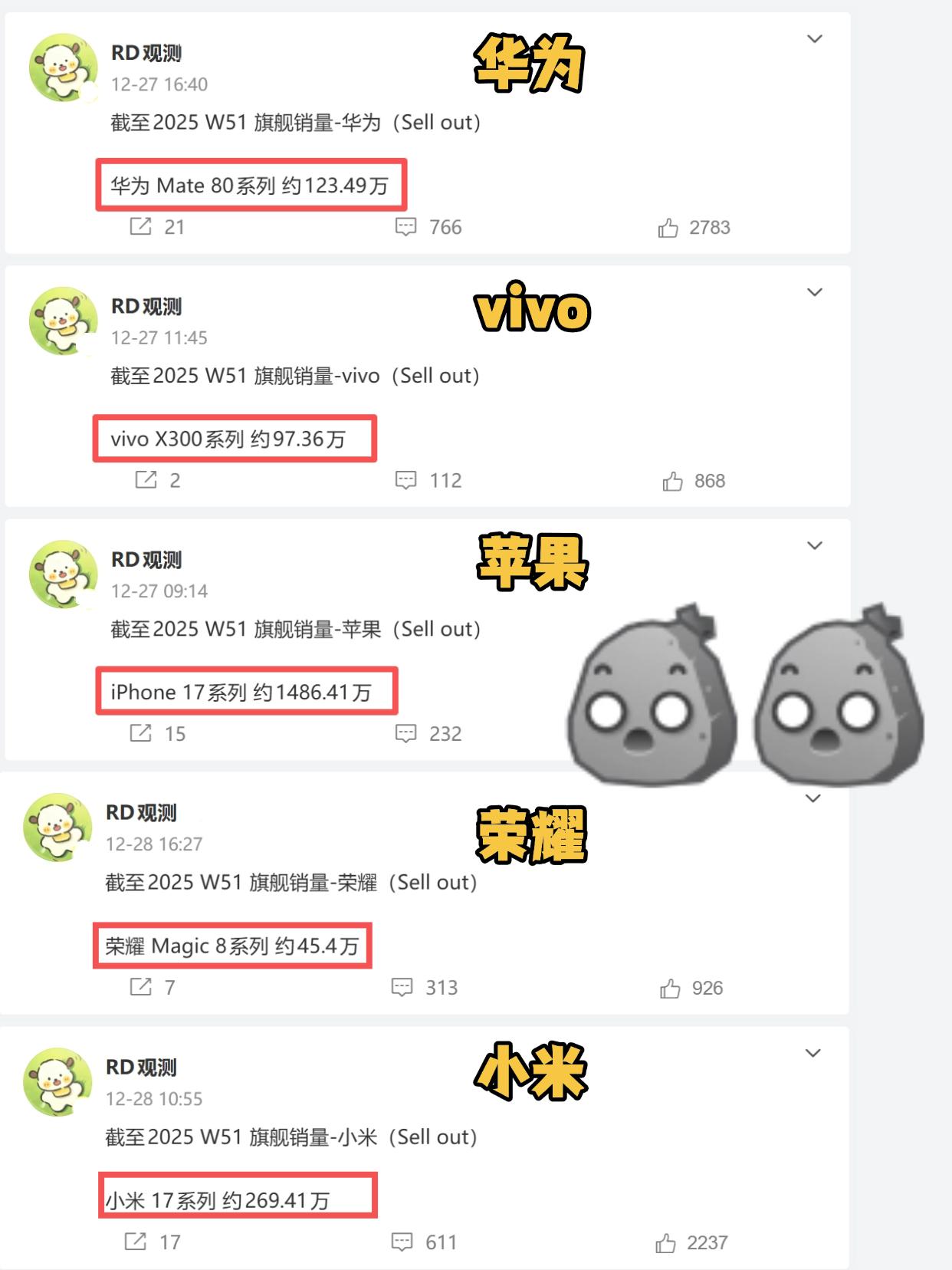国产天都塌了,苹果这也太炸裂了...... 知道今年iPhone 17系列卖的好,没想到是好到断层了!2025目前销量都快1500w了,不是苹果你是认真的吗?? 国产这边,开售比较早的小米17系列目前269.41w,华为Mate80系列目前123.49w,其他品牌都还没破百万,更别说赶上苹果的千万了...... 主要是苹果不仅卖得多,人家均价还高啊,iPhone都是大几千的,属于是又贵又畅销,其他厂商见到苹果这样,不得羡慕死啊??