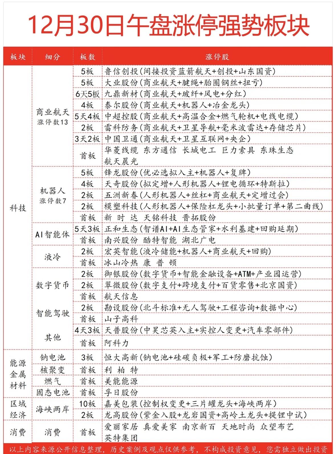 12月30日午盘涨停强势板块分析, 抓住投资机会! 商业航天、机器人板块领涨, 多股涨停;科技、智能驾驶跟涨, 市场热点集中。