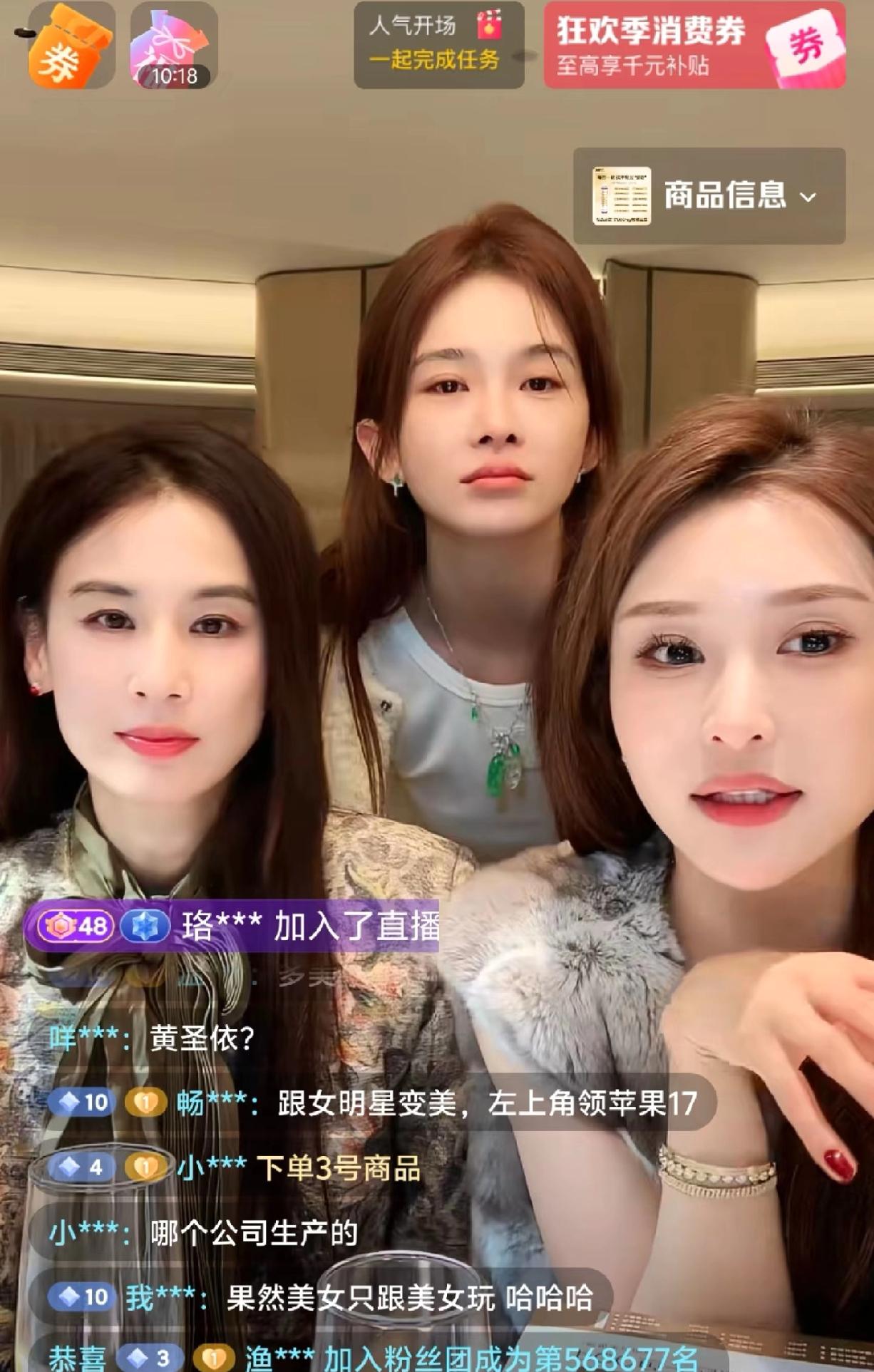 没想到的三个人在一起直播了,黄圣依,赵韩樱子还有我经常在某手上刷到的一个网红 ,黄圣依现在开始往网红圈那一片不接戏了吗?