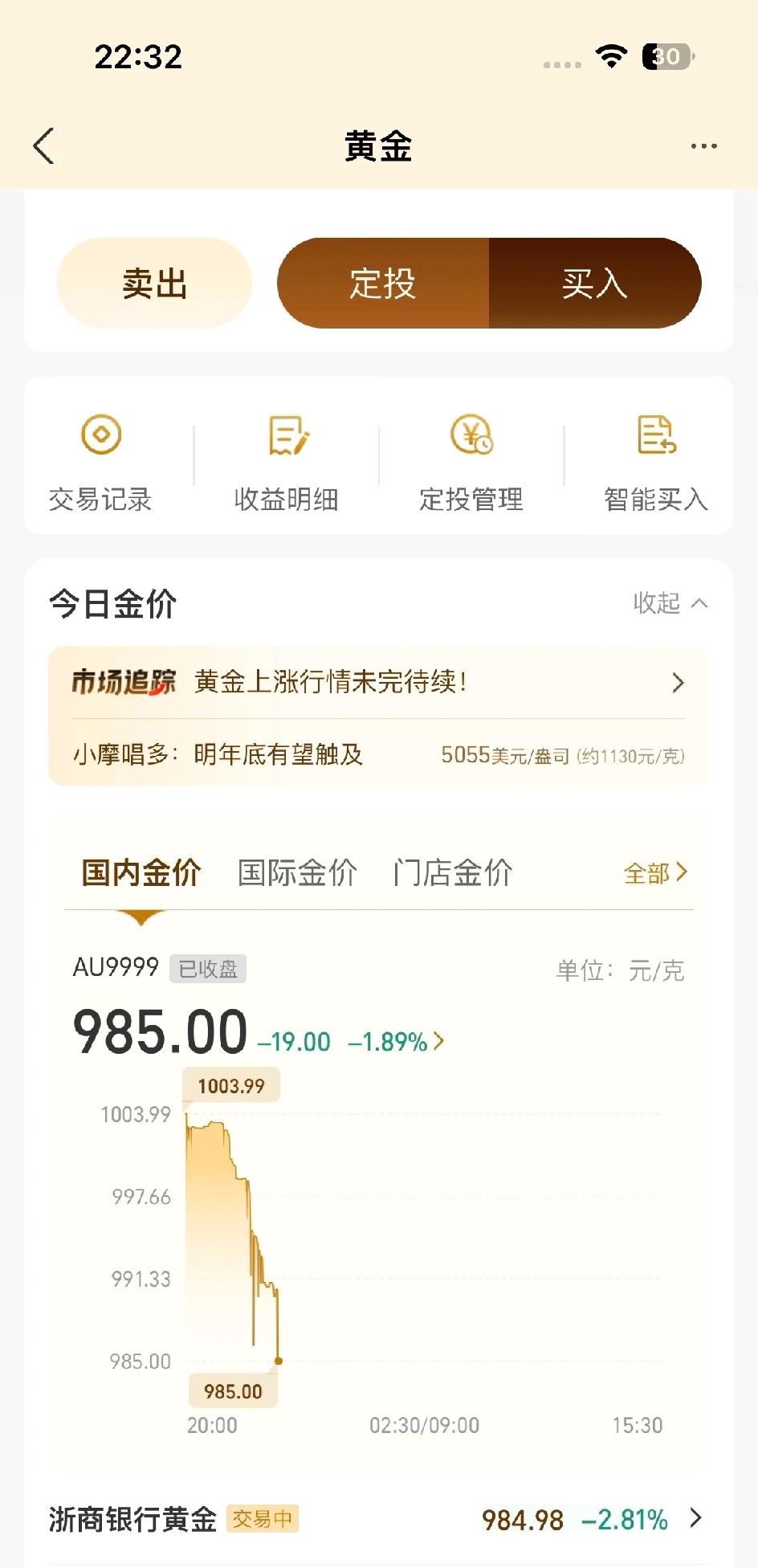 黄金这是发生了什么。 之前983上车的,焦虑了一个多月,昨天我终于解套了还赚了一点点点,有人叫我一直拿着,幸好我就知道会跌,再也不碰了。要是昨天没卖,我不知道又得焦虑多久。