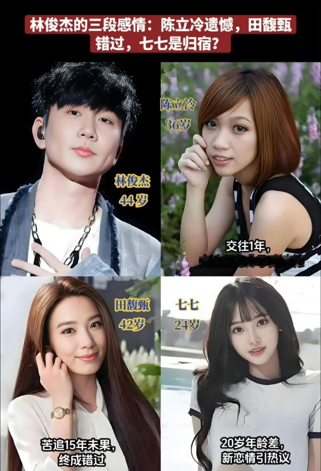 林俊杰和女友七七相差21岁 周杰伦和老婆昆凌相差14岁 胡彦斌和易梦玲相差16岁 潘玮柏和妻子宣云相差14岁 郭富城和妻子方媛相差22岁 杜淳和老婆王灿相差7岁 林峯和老婆张馨月相差10岁 黄晓明和叶柯相差15岁 歌手找的对象都好年轻,我们童年的男神,都被网红拿下!男明星怎么都爱女网红? 林俊杰终于官宣恋情了!女友是23岁网红七七,两人相差21岁,这年龄差让网友直呼"没想到"。其实早在11月25日,就有网友在洛杉矶偶遇他们逛街,当时工作室不回应,现在终于实锤了。 七七来头不小,是美国知名设计学院留学生,家境优渥,在东京、纽约都有豪宅。她长相萝莉身材火辣,和林俊杰的"大叔萝莉"组合意外般配。更早的线索是,林俊杰近年演唱会总为"特定女性"留第一排,去年6月贵阳站,七七就全程追星,今年2月已传秘恋。 从追星到恋爱,林俊杰的"黄昏恋"来得猝不及防。45岁的JJ终于找到真爱了,再晚点恋爱真要变黄昏恋喽!