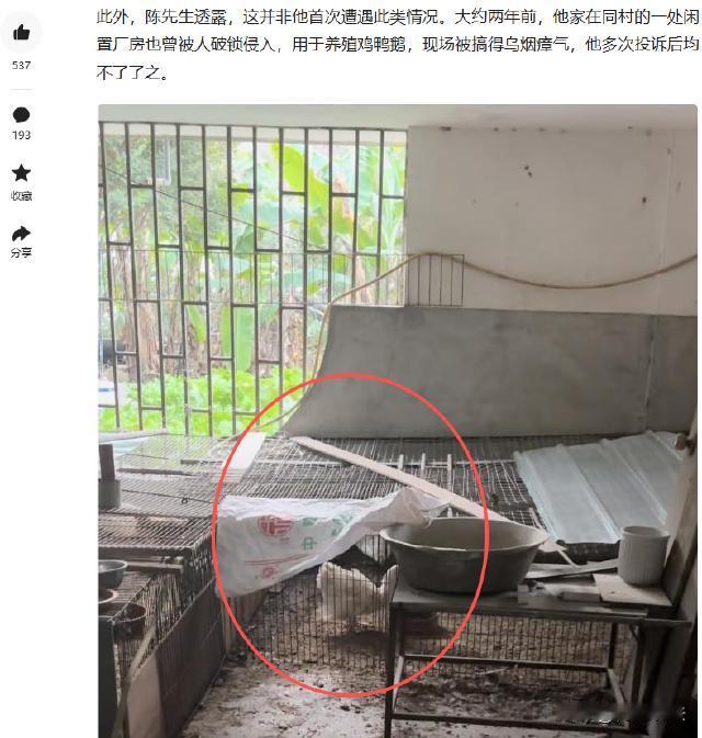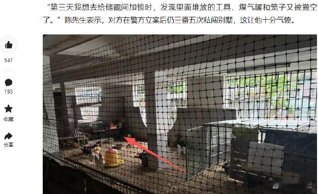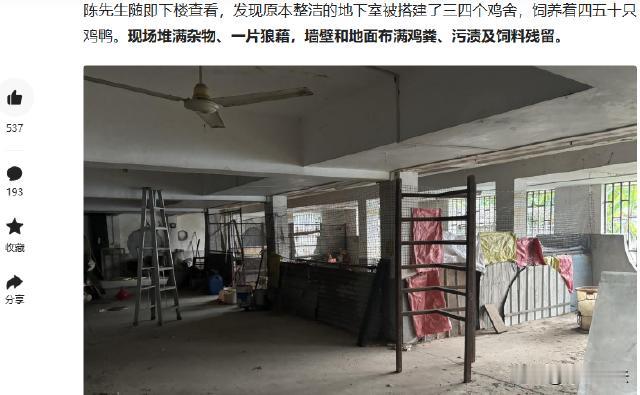 福建泉州,冬至时节,陈先生一家打算回老家祖宅别墅祭祖,可还没推开别墅大门,就闻到刺鼻鸡鸭屎味,打开门一看,地下室竟养了四五十只鸡鸭,现场脏乱不堪,储藏室也被占用还换了锁。陈先生花500多万建的别墅,竟被邻居如此糟蹋,他马上报了警,可邻居还偷偷搬东西,陈先生一家又气又闹心。 (来源:红星新闻) 陈先生,那可是个有眼光又有实力的人,早在2000年的时候,他就大手一挥,花500多万在老家建了一栋超级漂亮的别墅。 这别墅可不简单,有宽敞的花园,里面种满了各种花花草草,一到春天,那花香能飘出老远;还有那泳池,夏天的时候,一家人可以在里面尽情畅游,别提多惬意了。 别墅的装修更是豪华,从客厅的水晶吊灯,到卧室的进口家具,每一处都彰显着主人的品味和财力。一家人以前住在这里的时候,那可真是风光无限,亲戚朋友来了都羡慕不已。 后来家里发生了一些变故,老人离世了,家人又都外出经商,这别墅就渐渐没人住了,空了下来。这一空就是好长时间,陈先生一家人都在外面忙着打拼,也没怎么回过老家。 今年冬至到了,这可是个重要的节日,一家人就想着回别墅祭祖相聚,好好热闹热闹。陈先生带着一家人,满怀期待地往别墅赶。一路上,大家都在回忆着以前在别墅里的快乐时光,想象着这次相聚的温馨场景。 终于到了别墅前,还没等推开大门呢,一股刺鼻的鸡鸭屎味就钻进了大家的鼻子里。这味道,又臭又冲,熏得人直皱眉头。 陈先生心里“咯噔”一下,一种不好的预感涌上心头。他赶紧掏出钥匙,打开大门。眼前的景象,让他和家人都惊呆了。 只见地下室里,密密麻麻地养着四五十只鸡鸭。这些鸡鸭在里面乱跑,有的扑腾着翅膀,有的“嘎嘎”直叫,满地都是它们的粪便和杂物,脏乱不堪。再看那储藏室,原本是放一些杂物和贵重物品的地方,现在也被占用了,门锁都被换了,根本进不去。 陈先生看着自己花大价钱建的别墅,如今变成了这个样子,气得浑身发抖。他怎么也没想到,自己的邻居会做出这样的事。 这个邻居以前和陈先生一家关系还不错,逢年过节还会互相走动走动。可没想到,现在竟然趁着别墅没人,偷偷占用了。 陈先生强压着怒火,赶紧报了警。可这邻居呢,不但没有收敛,反而更加过分了。在民警来之前,还偷偷地往外面搬东西,好像这别墅就是他自己的一样。 陈先生一家又气又闹心,这好好的别墅,现在变得又脏又乱,根本没法住人了。要想进去,还得先进行全面的消杀,不然那味道和卫生条件,谁受得了。 陈先生越想越气,他决定不能就这么算了,一定要追究邻居的责任。他要求邻居把别墅恢复原状,把地下室里的鸡鸭都弄走,把储藏室的锁换回来,里面的东西归位。 还要把别墅翻新一下,毕竟被鸡鸭折腾了这么久,肯定有不少地方都损坏了。最后,还得进行全面的消杀,确保别墅的卫生安全。 邻居太过分了,不尊重别人的财产;有的说陈先生维权是对的,不能让这种不良风气滋长。 毕竟,如果这次陈先生不追究,以后说不定还会有更多的人效仿,那大家的财产安全可就没保障了。 有些人看到别人家的东西没人管,就起了歪心思,想占为己有。他们以为自己做得神不知鬼不觉,没人会发现。可他们不知道,这种行为不仅是不道德的,更是违法的。就像陈先生的邻居,他的行为已经触犯了法律。 从法律层面来看,陈先生邻居的行为那可真是问题不小。先说说非法侵入住宅这一条,依据《刑法》第二百四十五条规定,非法搜查他人身体、住宅,或者非法侵入他人住宅的,处三年以下有期徒刑或者拘役。 这邻居未经陈先生允许,就闯进人家的别墅,还在里面养鸡鸭,这明显就是非法侵入住宅。别墅可是陈先生的私人财产,他有权决定谁可以进去,谁不可以进去。邻居这种行为,严重侵犯了陈先生的住宅安宁权。 再说财产损害这一块,按照《民法典》的规定,行为人因过错侵害他人民事权益造成损害的,应当承担侵权责任。 陈先生的别墅被邻居占用,还养了这么多鸡鸭,导致别墅内部脏乱不堪,很多地方都损坏了。这邻居肯定是有过错的,他应该停止侵害,把别墅恢复原状,该清理的清理,该修理的修理。 而且,陈先生因为邻居的这些行为,肯定遭受了一定的损失,比如别墅的贬值、清理和翻新的费用等等,邻居还应该赔偿这些损失。 要是陈先生不追究邻居的责任,那邻居可能会觉得自己的行为没什么大不了的,以后说不定还会继续干这种缺德事,甚至变本加厉。 邻居和陈先生以前关系不错,是可以私下协商解决的,不用闹到法律层面。但私下协商也得邻居愿意配合,现在邻居偷偷搬东西,明显没有协商的诚意。 当协商无法解决问题时,就需要通过法律途径解决了。 有人说陈先生长时间没回别墅,是不是对别墅的管理存在疏忽,邻居是不是可以借此减轻责任。 其实不然,不管陈先生多久没回别墅,别墅的所有权还是属于陈先生的,邻居没有任何权利侵犯。邻居的行为是故意为之,不存在减轻责任的理由。
