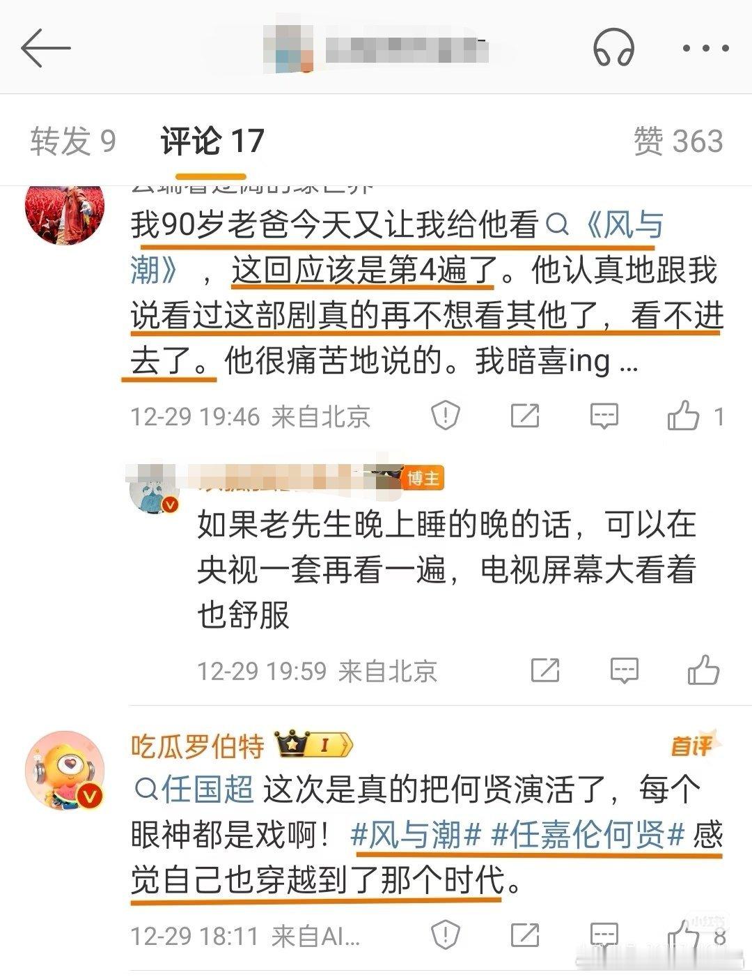 电视剧风与潮深得爷奶喜欢,有位网友说他90多岁的老爸把风与潮看了四遍!!!任嘉