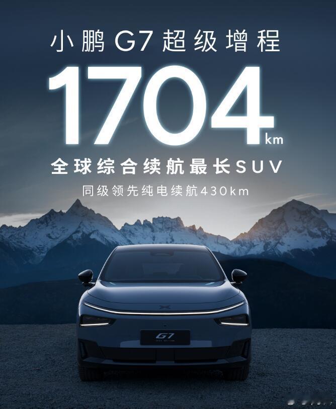 综合1704km,纯电430km,还有55.8度电池和 60L油箱,小鹏G7增程版这个参数也是很可以的。之前我们就猜测小鹏要给全系列都上增程,新款P7+之后,现在G7也如此了。看来增程确实是现阶段一个比较均衡的解决方案,追求的是纯电驾感,比插混更追求经济性。而且,增程车型的价格往往都比纯电的更便宜,毕竟电池包小了一些,成本能降很多,对于消费者来说,无疑也是真香的。1704公里超长续航SUV小鹏G7来了小鹏G7超级增程