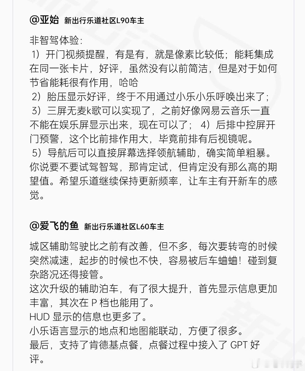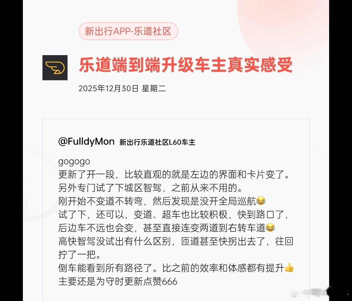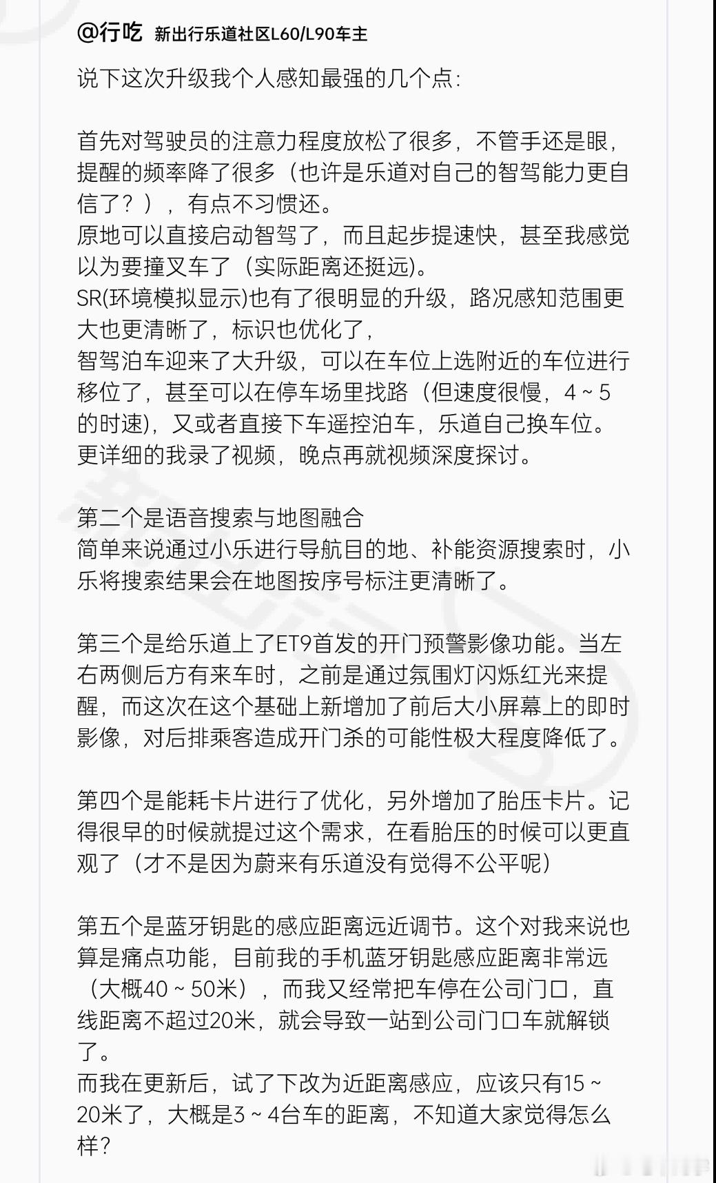 关于乐道OTA端到端后,那里汇总了新出行社区用户的体验电车同学随便聊大v聊车