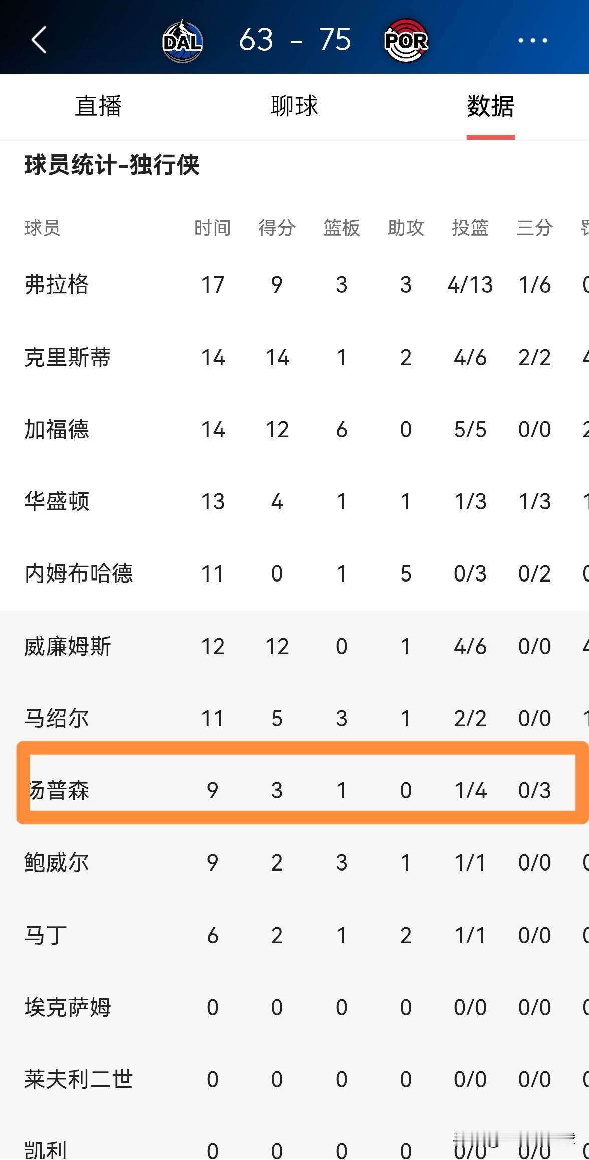 我强烈建议独行侠立刻交易走克莱-汤普森!在今天独行侠客场挑战开拓者的上半场比赛中,汤普森的手感非常冰凉,他在替补出战的9分钟里,投篮4中1,其中三分球3中0、罚球3中1非常低效的得到3分。 毫不夸张的说,如果独行侠想要成功闯进本赛季的季后赛,那么球队必须将汤普森交易走,如今的汤普森在投篮端的表现极其不稳定。