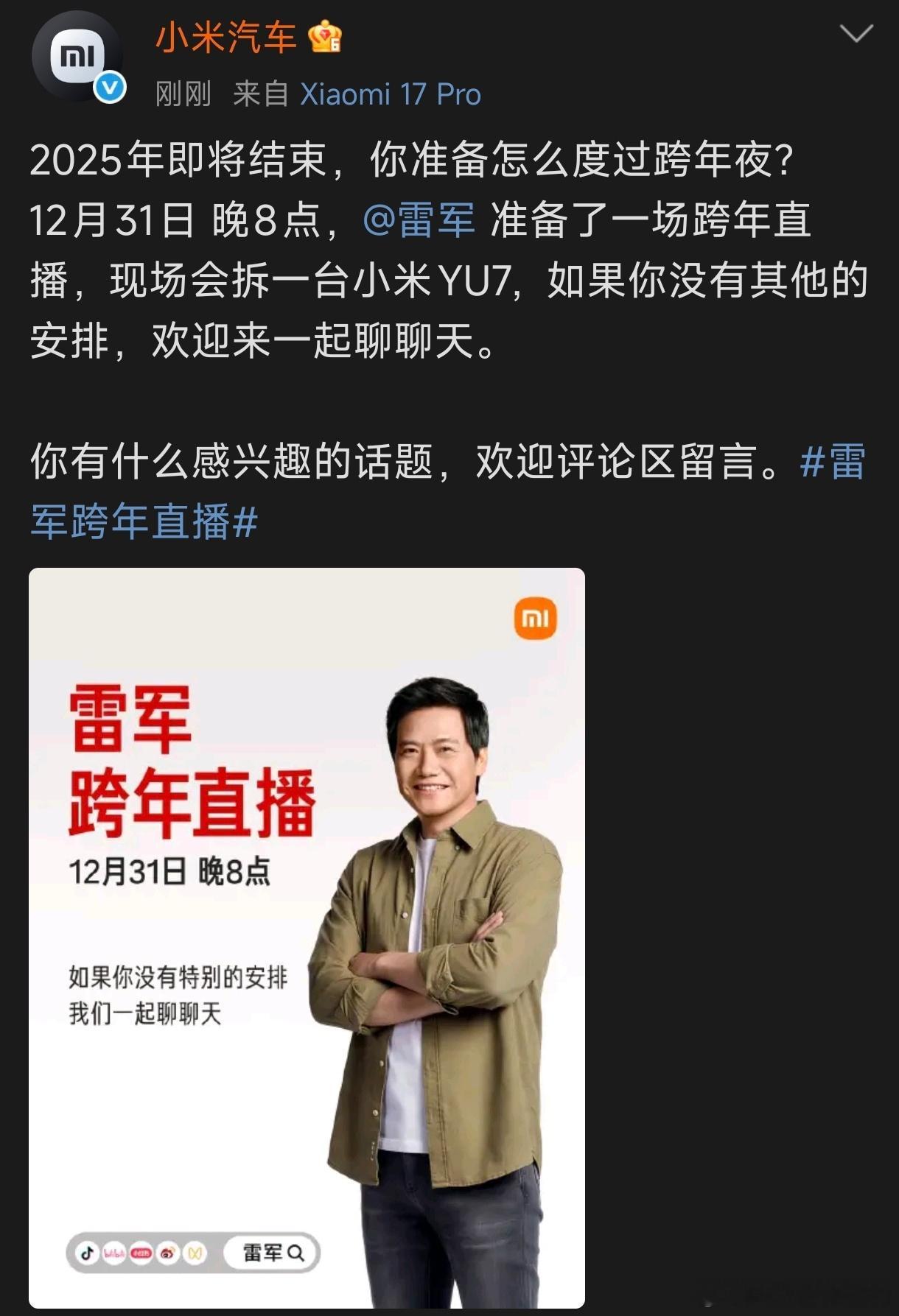 12月31日 晚8点,准备了一场跨年直播,【现场会拆一台小米YU7】这个必须蹲一波 雷军跨年直播拆车