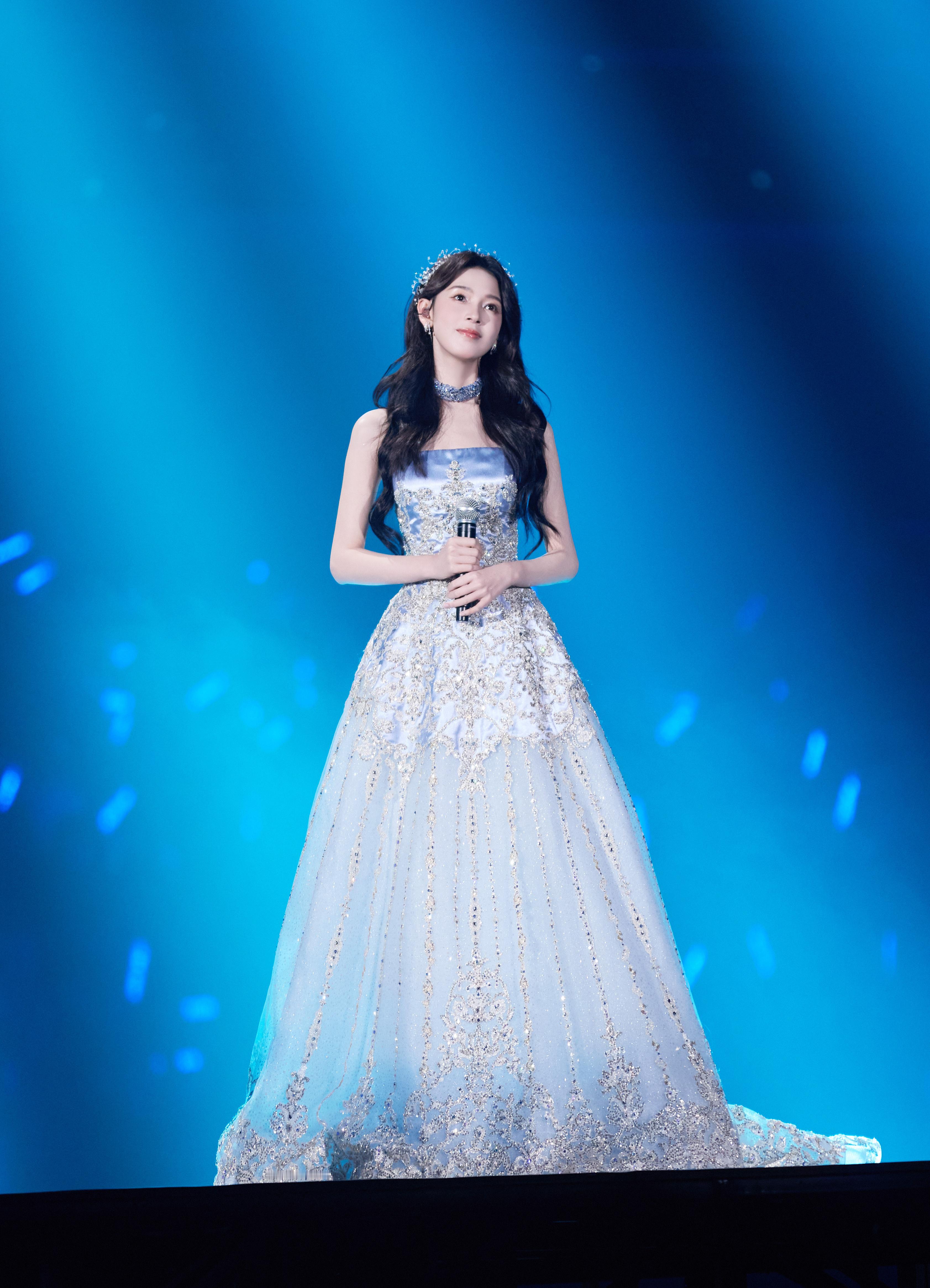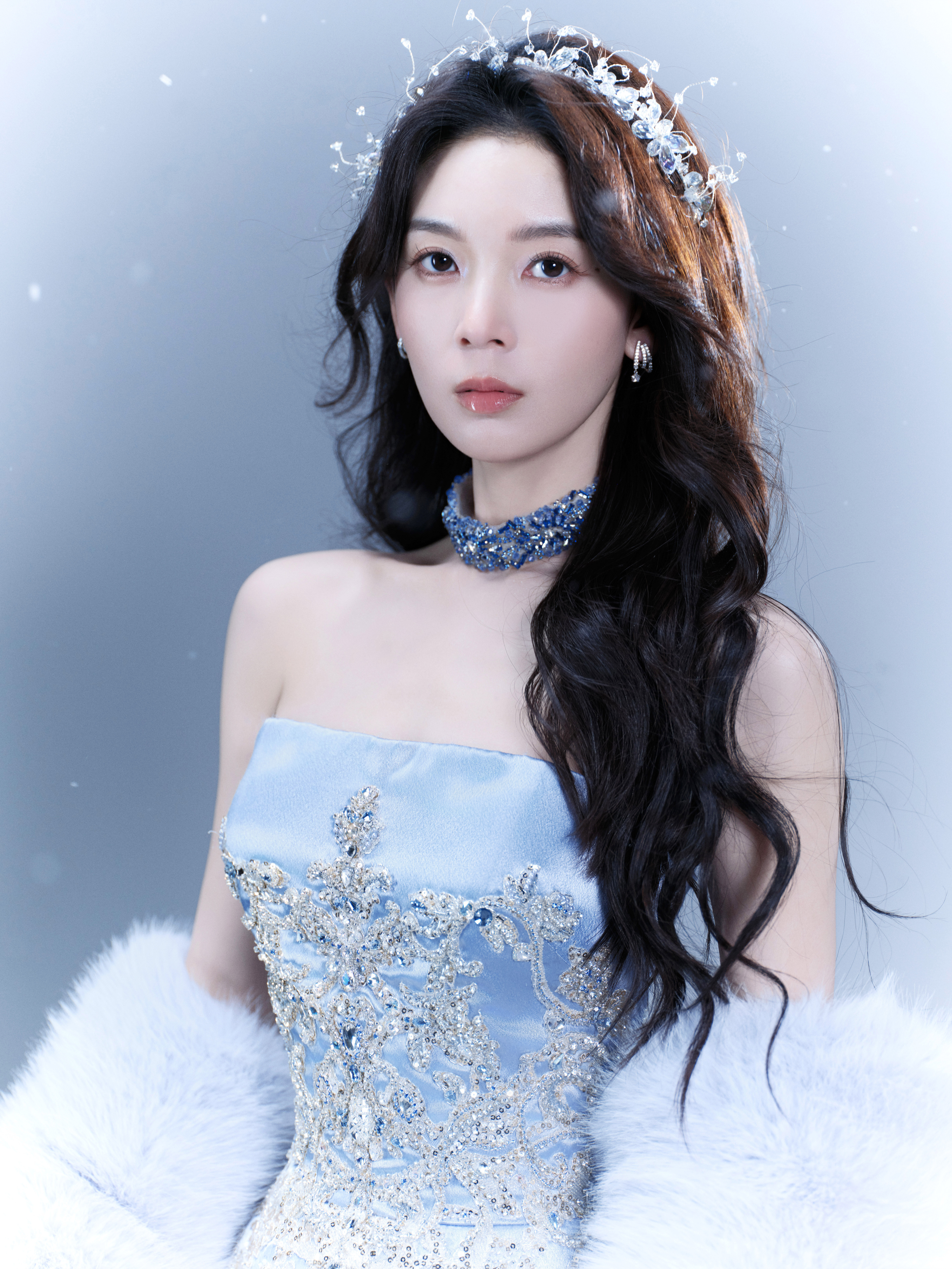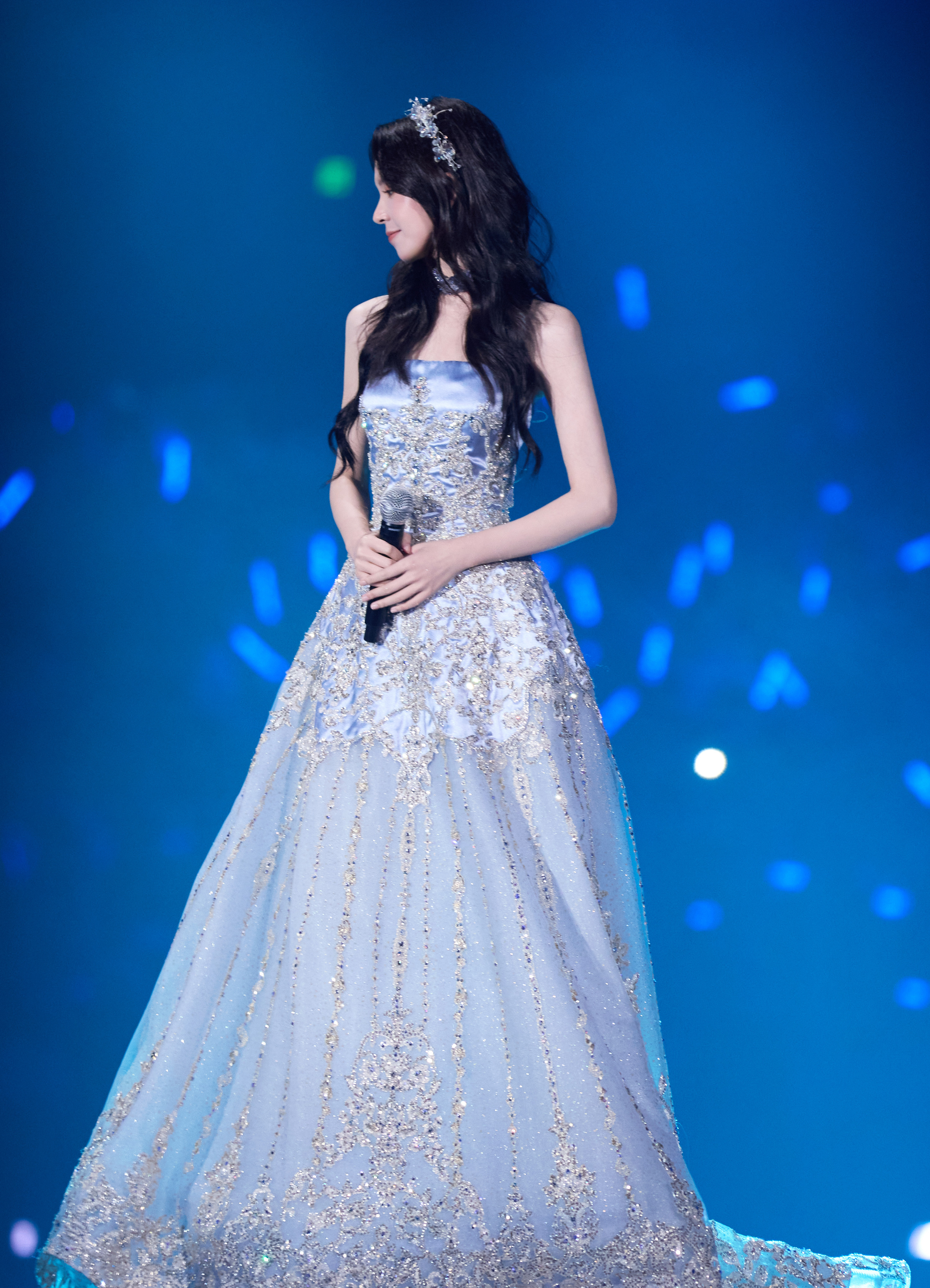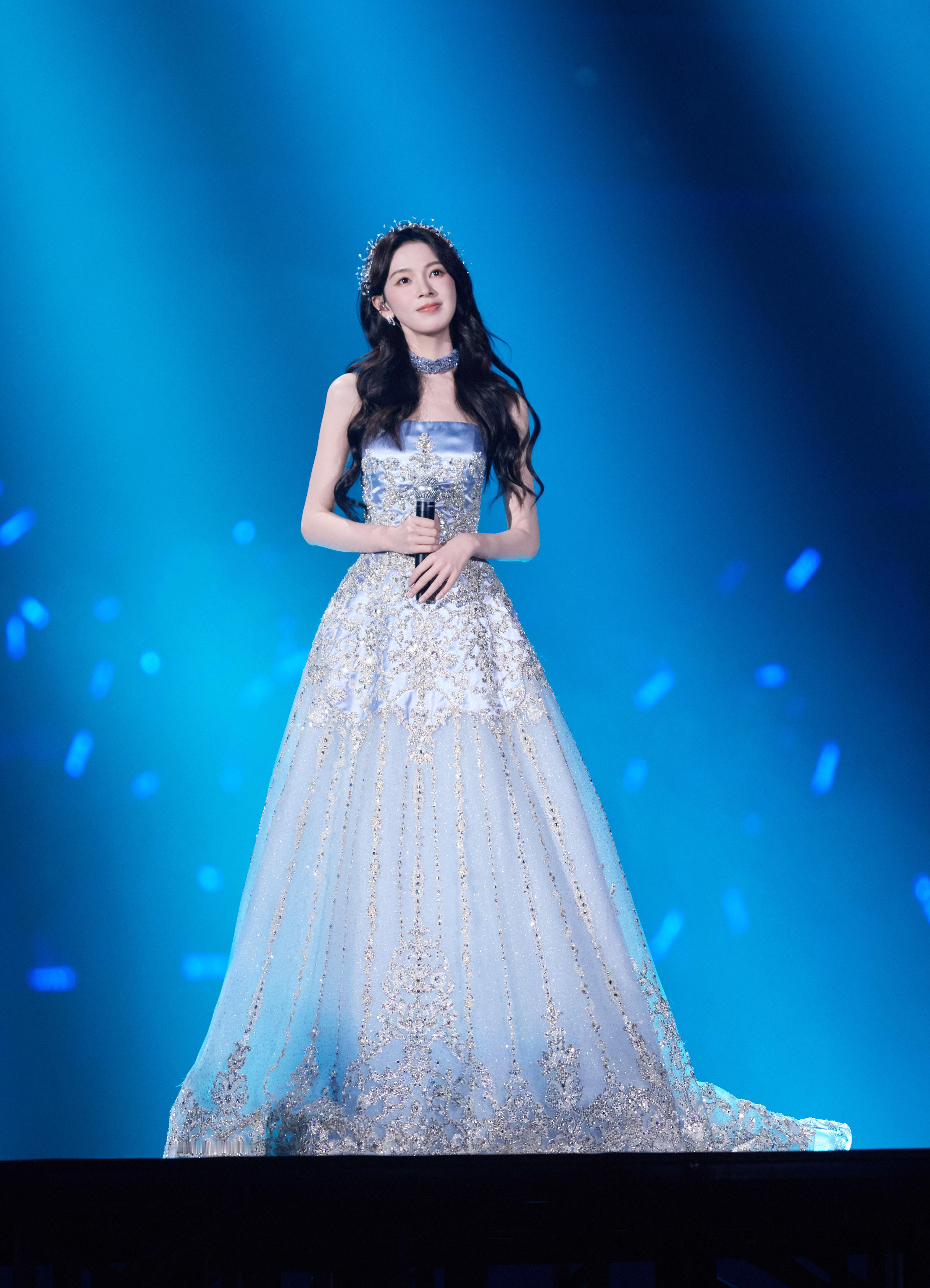 陈瑶 冰蓝礼裙的抹胸设计露尽肩颈的精致,鎏金刺绣勾勒出胸腰的玲珑曲线。