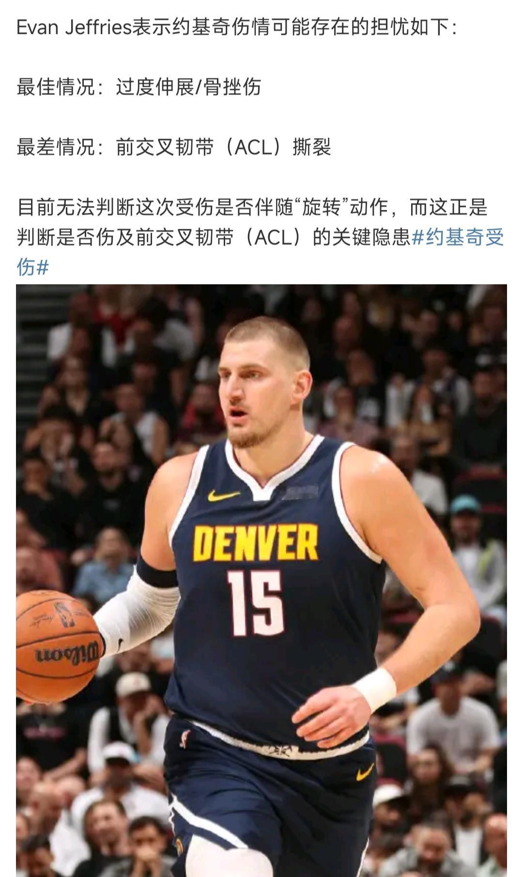 约基奇要是重大伤病怎么办呀! 他的常规赛MVP,一直排第一呢。 还有掘金冲击西部前三,没他怎么办。 运气好4-6周,两个月就能复出。 运气不好,半年到一年呢。[可怜]
