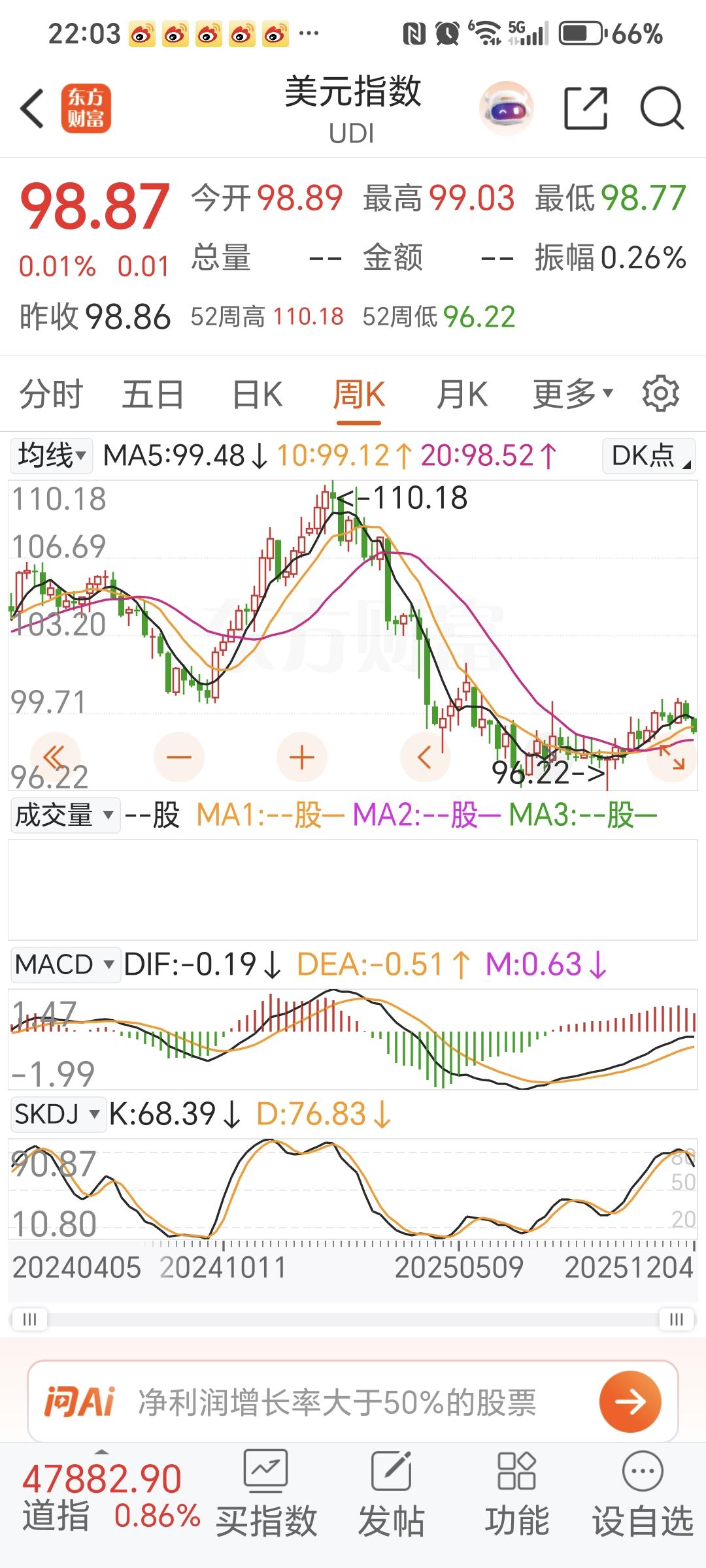 美元“褪色”,技术面坐实熊市! 美元指数年内暴跌8%、30年新低预警的信号里,美元的颓势早已不是“短期波动”! 看看美元指数周K线就能一目了然:2024-2025年初冲至110.18的高点后,指数像“高台跳水”般一路下探,如今停在98附近,52周累计跌幅超12%,完全符合“从阶段高点跌超20%即进入熊市”的技术定义。 周线级别的均线和指标更是同步“唱空”,持续向下压制,就算下探20日小幅支撑仅能暂缓跌势,无法扭转中期颓势;今日虽有弱反弹信号却缺乏持续动力,SKDJ从超买区回落,预示着短期震荡后仍会重回下跌轨道。 这种技术面的熊市,本质是美元霸权“褪色”的直观体现,美国38万亿国债压顶、制造业“九连阴”,美联储降息让美元资产吸引力骤降,加上东盟、金砖国家加速“去美元化”,黄金突破4300、人民币欧元“异军突起”,全球金融从“单极”转向“多极”,华尔街的资产配置也到了换赛道的时刻! 大A的池子足够的大!欢迎华尔街大佬来游泳!!!