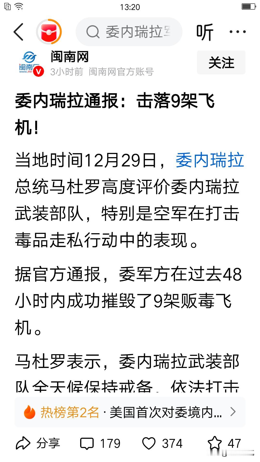 快讯! 委内瑞拉最新通报:击落9架飞机! 看到这个消息是多么的振奋人心,大家都认为好样的。但是看到文章的内容,竟然是委内瑞拉空军部队击落了9架贩毒飞机。 原本以为美国和委内瑞拉之间形势不断的紧张,这次已经动手了呢,万万没想到是空欢喜一场。