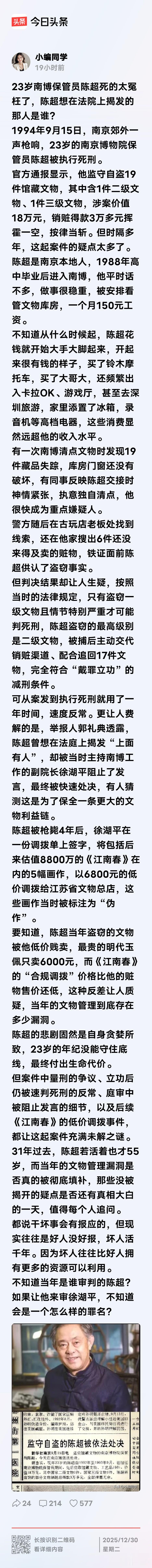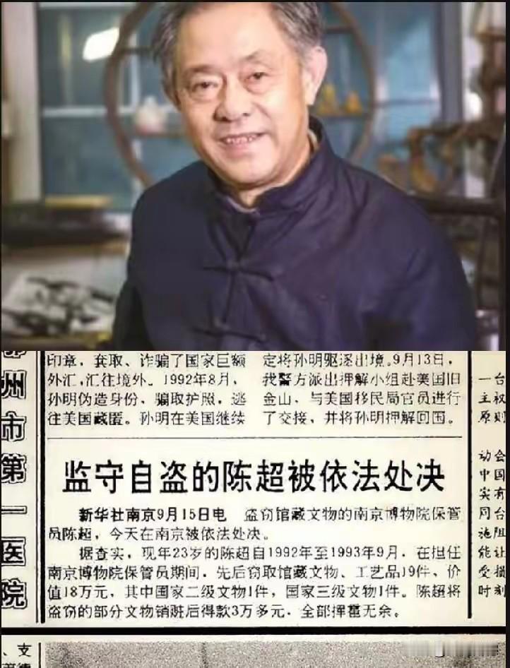 徐湖平之前,早在1994年,南京博物院还发生过保管员偷盗文物的事情,以前真没有听说过,偷盗文物的这个人叫陈超,后来被判处了死刑,在他偷盗文物的时候,徐湖平在南京博物院担任副院长,把这个事联系起来后发现,这里面的情节有些扑朔迷离,很是复杂!