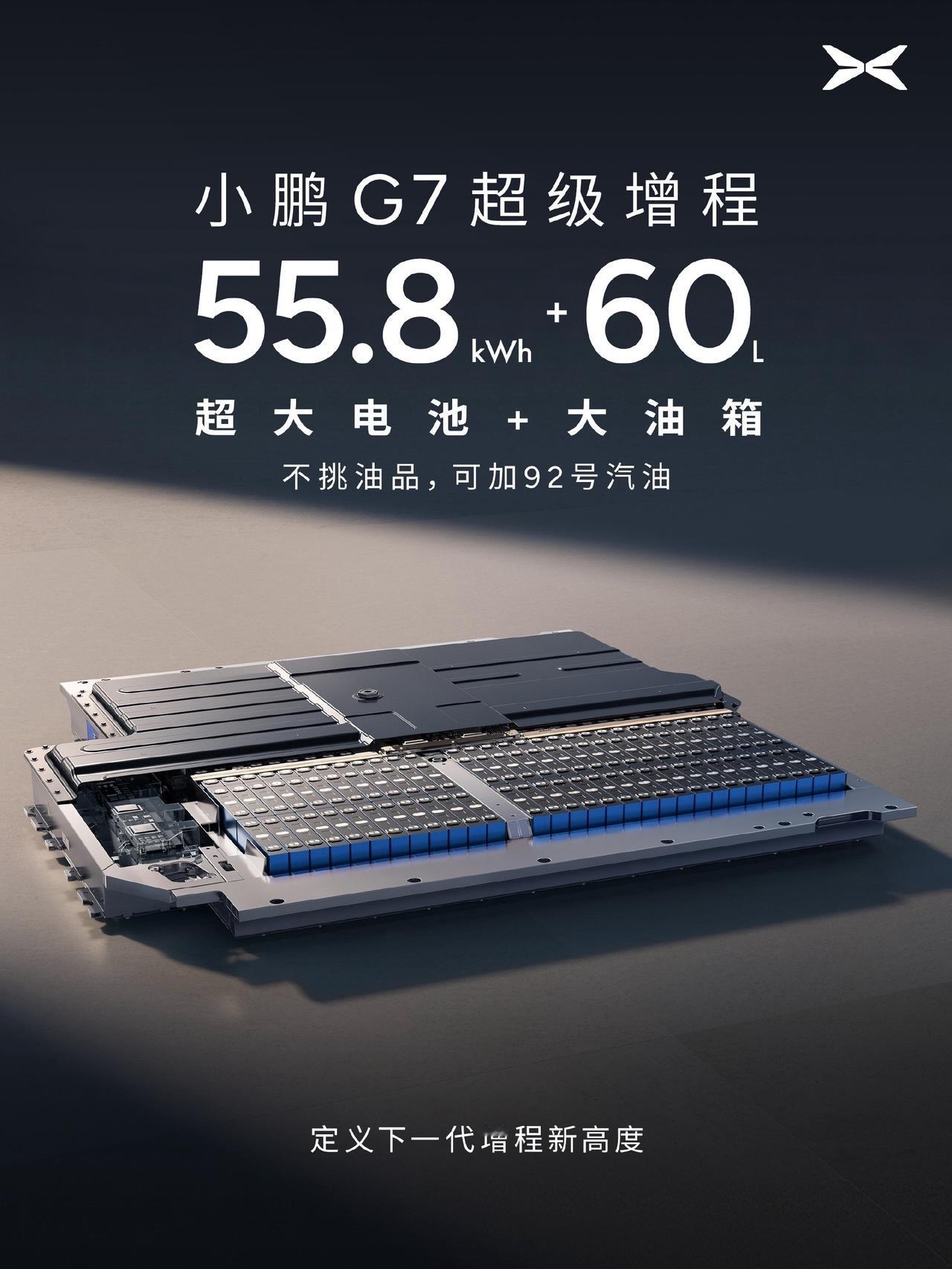 【大电池+大油箱!小鹏G7超级增程更多信息曝光】12月30日,小鹏汽车正式公布了小鹏G7超级增程的相关产品信息,作为小鹏推出的第三款增程车型,新车在造型上依旧保持着非常时尚个性的姿态,贯穿式灯组以及分体式大灯组合出足够的辨识度,同时小鹏G7超级增程也对底部包围进行了调整,改用平直线条的贯穿式格栅护板设计,进一步拓宽整个前脸的视觉效果。 作为重点,小鹏G7超级增程将会采用大电池+大油箱的增程动力方案,55.8度电池组能够为这台SUV提供430公里的纯电续航里程,同级唯一的800V+5C超充AI电池最快12分钟补能314公里,即便是没有家充条件的用户,也能非常方便快捷的体验低成本出行的快乐。而60L的大油箱让小鹏G7超级增程拥有1704公里的综合续航,只需要加注92号汽油成本更低,节假日长途出游更有底气。 除了账面数据足够惊艳外,小鹏G7超级增程还标配主动降噪功能,配合超静谧无感增程器以及全车关键部位吸音棉覆盖率超过90%,尽可能地减少增程器的存在感,使用体验更接近纯电产品。【来自懂车帝车友圈】