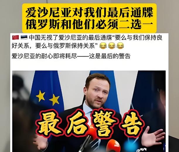 就问中国怕不怕?强大的爱沙尼亚向中国发出最后通牒,让中国必须在爱沙尼亚和俄罗斯之间选择一个,意思是不选他们后果自负,“要么站在爱沙尼亚这边,要么与俄罗斯为伍,不选后果自负! 先说说爱沙尼亚为啥敢这么硬气。作为欧盟和北约的双重成员国,这些年爱沙尼亚靠着西方阵营的支持,在对俄立场上一直走得很极端。 数据显示,2024 年爱沙尼亚对乌援助占本国 GDP 的比例高达 1.8%,在欧盟国家里排第一,比德国、法国这些大国都要激进。 而且它还常年在网络安全领域给自己贴 “高手” 标签,号称拥有全球最顶尖的网络防御部队,甚至多次宣称 “成功拦截俄罗斯网络攻击”,这种自我认知让它在国际舞台上越来越敢发声。 但光有姿态没用,得看硬实力。爱沙尼亚国土面积还不到 5 万平方公里,人口刚过 130 万,GDP 总量在 2024 年也就 380 亿欧元左右,还不如中国一个二线城市的经济体量。 军事上,它的现役军人只有 6000 多人,主战坦克不过几十辆,空军更是只有几架教练机和直升机,连像样的战斗机都没有。 这样的国力,就算背后有北约撑腰,也实在没资格对中国提 “后果自负” 的要求。 再看所谓的 “二选一”,对中国来说根本就不成立。 中国和俄罗斯的关系是新时代全面战略协作伙伴关系,不是军事同盟,双方的合作基于不结盟、不对抗、不针对第三方的原则,这一点早就说得明明白白。 爱沙尼亚之所以敢跳出来,本质上是想借着西方对俄制裁的风口刷存在感。 自从俄乌冲突爆发后,波罗的海三国因为和俄罗斯地缘相邻,一直把反俄当作政治正确,甚至不惜牺牲自身利益。 爱沙尼亚这次逼中国站队,一方面是想向欧盟和北约表忠心,争取更多的军事和经济支持;另一方面也是想借着 “反俄” 议题提升国际关注度,毕竟在众多欧洲国家里,它平时实在没太多话语权。 但这种 “绑上战车” 的做法,最终只会害了自己。中国在国际事务中一直坚持独立自主的和平外交政策,从不接受任何国家的 “二选一” 胁迫。 当年美国逼盟友选边站,不许和华为合作,结果不少欧洲国家都遭受了经济损失,5G 建设进度大幅滞后。 爱沙尼亚现在重走老路,真要是敢对中国采取制裁或限制措施,首先受损的就是自己的经济。 要知道,中国的新能源电池、电子设备等产品,在欧洲市场有着很强的竞争力,爱沙尼亚放弃中国市场,很难在短时间内找到替代者。 从国际局势来看,爱沙尼亚的做法也不符合时代潮流。 现在全球经济相互依存,和平发展才是主流,强行逼他国站队,只会加剧阵营对立,不利于冲突的解决。 中国一直致力于劝和促谈,推动俄乌双方回到谈判桌前,这种务实的态度得到了国际社会的广泛认可。 而爱沙尼亚一味激化矛盾,甚至试图拉第三方入局,只会让地区局势更加复杂。 爱沙尼亚大概忘了,现在的中国早已不是几十年前的中国,我们有足够的实力和底气应对各种外部压力。 面对各种胁迫和施压,中国从来都是兵来将挡水来土掩,就像应对美国的芯片禁令一样,越是被围堵,越能激发自主创新的动力。 说到底,爱沙尼亚的 “最后通牒” 更像是一场自导自演的政治秀,除了博眼球之外,根本起不到任何实际作用。