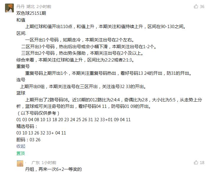 辛丹丹来啦!今晚丹丹4码定蓝:01 04 09 11,其中09 11围绕近期的08 10选择意图明显继续防热号,01 04则是关注小号继续反弹;红球双胆03 26,其中03位于近期刚刚大热的一区小号,但上期一区热度已降低。距离丹丹6+2预测中头奖已过去整整5年,彩友已经迫不及待见到下次预测中头奖,不知道啥时能到来呢?[大笑][大笑]
