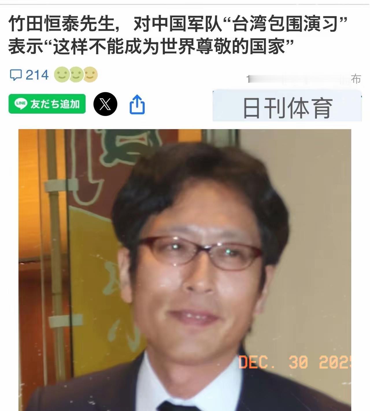 针对中方军演!日本人表态! 自称是日本天皇后裔的竹田恒泰29日在社交媒体上妄言称,“中国就是这样野蛮的地方。区分使用糖果和鞭子,控制周边各国,从几千年前就没有改变。这样的话,就不能成为世界尊敬的国家。” 说出这话的竹田恒泰,可不是什么普通人。他是日本著名的右翼保守主义代表人物,顶着“明治天皇玄孙”的名头。这人一向以发表激进言论出名,长期贬损中国,还出过一本叫《中国的事情很搞笑,但笑不出来》的书来拼凑反华内容。连日本法院在2021年都曾认定,他那些针对中韩的侮辱性言论属于“种族主义者”的行径。 他这次跳出来攻击,直接针对的是中国人民解放军东部战区近日在台岛以东组织的远海战备巡航。这次巡航完全是中国军队按年度计划进行的例行训练,目的是检验部队的远域机动作战能力,合理合法。中方早已反复强调,类似演训活动符合国际法和国际实践,不针对任何特定国家。 竹田的恶毒攻击并非偶然。他有着一套顽固的极端立场,不仅鼓吹参拜靖国神社,甚至曾将东京都知事访华接受中方印章的行为,恶意歪曲为是向中国“朝贡”。对于冲绳的独立运动,他更是曾危言耸听地宣称要动用自卫队,并以“内乱罪”来威胁。他此次的言论,正是其长期反华思想的一次集中爆发。 这种言论的危害性极大。它刻意混淆视听,将中国正当的国防行为污名化为“霸权”和“控制”,目的就是为日本国内右翼势力渲染“中国威胁论”、鼓动对抗情绪提供弹药。这完全是在开历史倒车,企图破坏地区的和平稳定。 对于这种挑衅,中方的立场是一贯且坚定的。中国国防部早已明确警告,对日本右翼势力为军国主义招魂的行径必须共同遏阻,对一切滋扰挑衅,中方都将依法依规坚决反制。中国军队捍卫国家主权和领土完整的决心坚定不移,正如国防部所言,解放军全时待战、随时能战。 从历史的纵深看,真正需要反思“野蛮”二字的,恰恰是日本军国主义自身。如今,中国通过自身的和平发展赢得了世界越来越多的尊重。反倒是竹田恒泰之流,死抱着陈旧腐朽的极端思想,其荒谬言论既违背事实,也背离时代潮流,最终只会被国际社会所鄙视。中国的和平发展道路不会因为几声杂音而改变,任何诽谤与挑衅都动摇不了我们维护自身正当权益的决心。 各位读者你们怎么看?欢迎在评论区讨论。