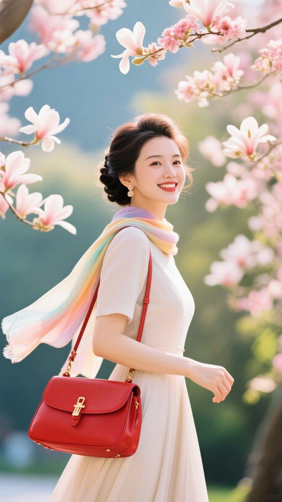 春枝畔的素白裙 风裹着花香气漫来时,素白裙角轻蹭过枝桠。彩虹丝巾垂在肩侧,像把春阳的柔色揉作软纱,随步履轻晃。 耳坠沾了花影的暖光,红皮包的扣光亮得像枝上初绽的蕊,笑意舒展时,连落瓣都慢了节奏。裙料裹着自然的松弛,每道纹理都浸着春的温软——像把满树粉白,都织进了这一身舒展里。 原来春日的生动从不是繁艳堆砌,是这样妥帖的自在,让花光都绕着她轻转,落进眼底时,便成了最鲜活的春讯。 春日氛围感 素裙花影