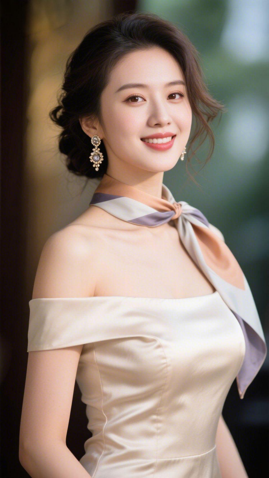 暖光里的浅金裙 柔暖的光落在肩头,浅金色缎面裙像裹了层融开的日光。露肩的线条衬着舒展的肩颈,丝巾绾作轻软的结,浅紫与米白的边缘随气息微晃。 耳坠碎钻沾了光,亮得像檐角垂落的星子,笑意漫开时,连周遭的风都放缓了节奏。裙料妥帖地裹着舒展的姿态,每道纹理都浸着松弛的温和——像把春日最软的云,揉进了这一身浅金里。 原来舒展的美从不是刻意的精致,是这样自然的松弛,让光都甘愿慢下来,落在她眼底,成了最妥帖的暖意。 松弛感美学 缎面裙氛围