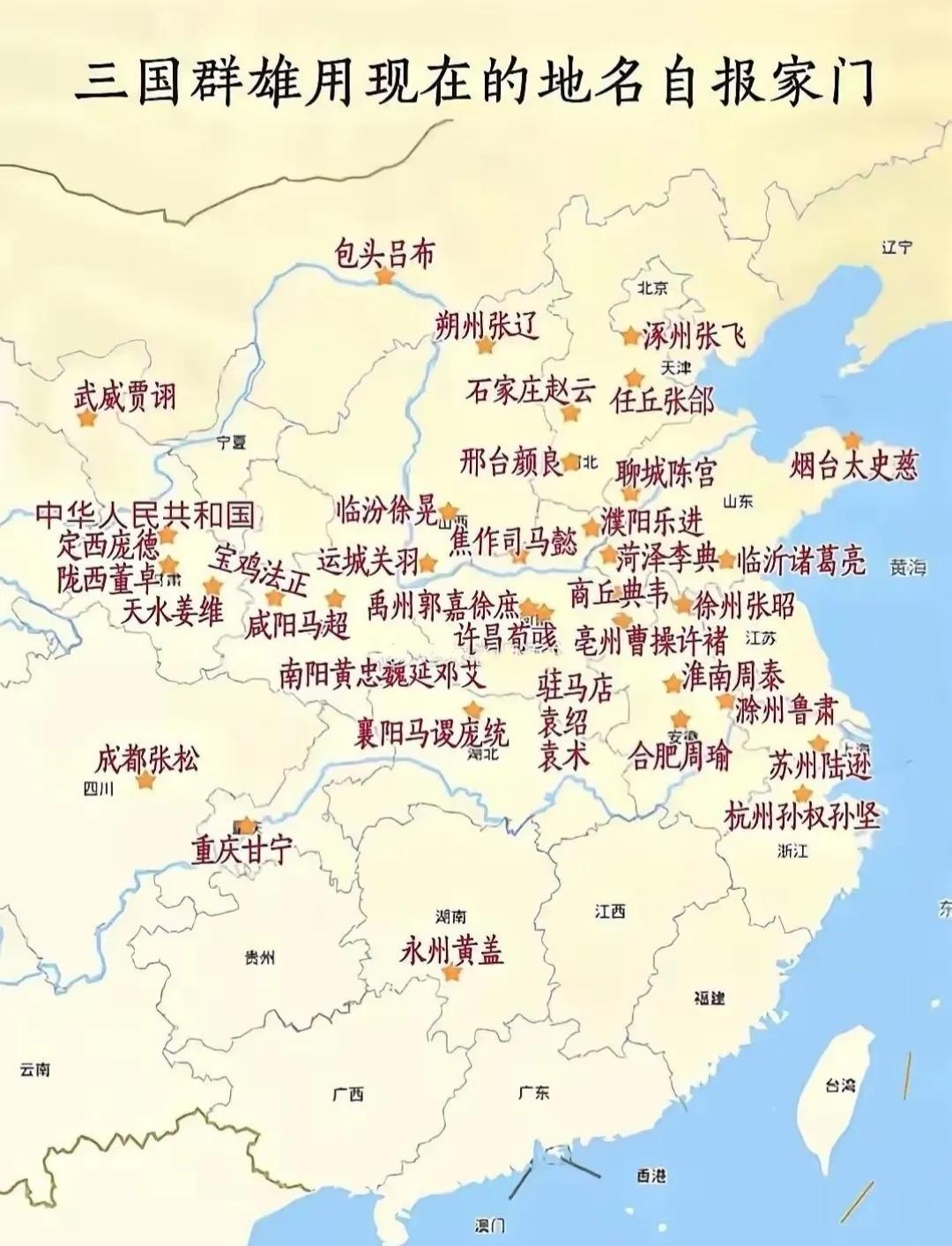 三国群雄现代籍贯大乱斗:吕布包头张飞涿州,赵云石家庄孔明临沂,曹操亳州孙权杭州,周瑜合肥马超咸阳,英雄故里新说。