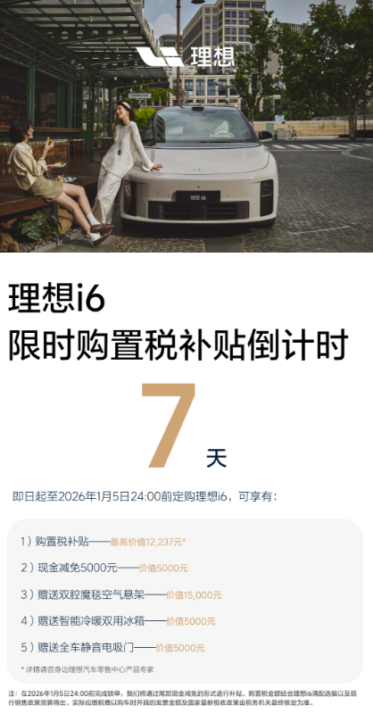 限时购置税补贴倒计时就还几天的时间了,刚看了一下,即日起到2026年1月5日前入手理想i6,不仅有购置税补贴。还有双腔魔毯空气悬架、智能冷暖双用冰箱、全车静音电吸门,这些都会赠送。感觉年轻家庭选择理想i6还是蛮香的,驾乘感受都非常不错。续航方面也很够用。