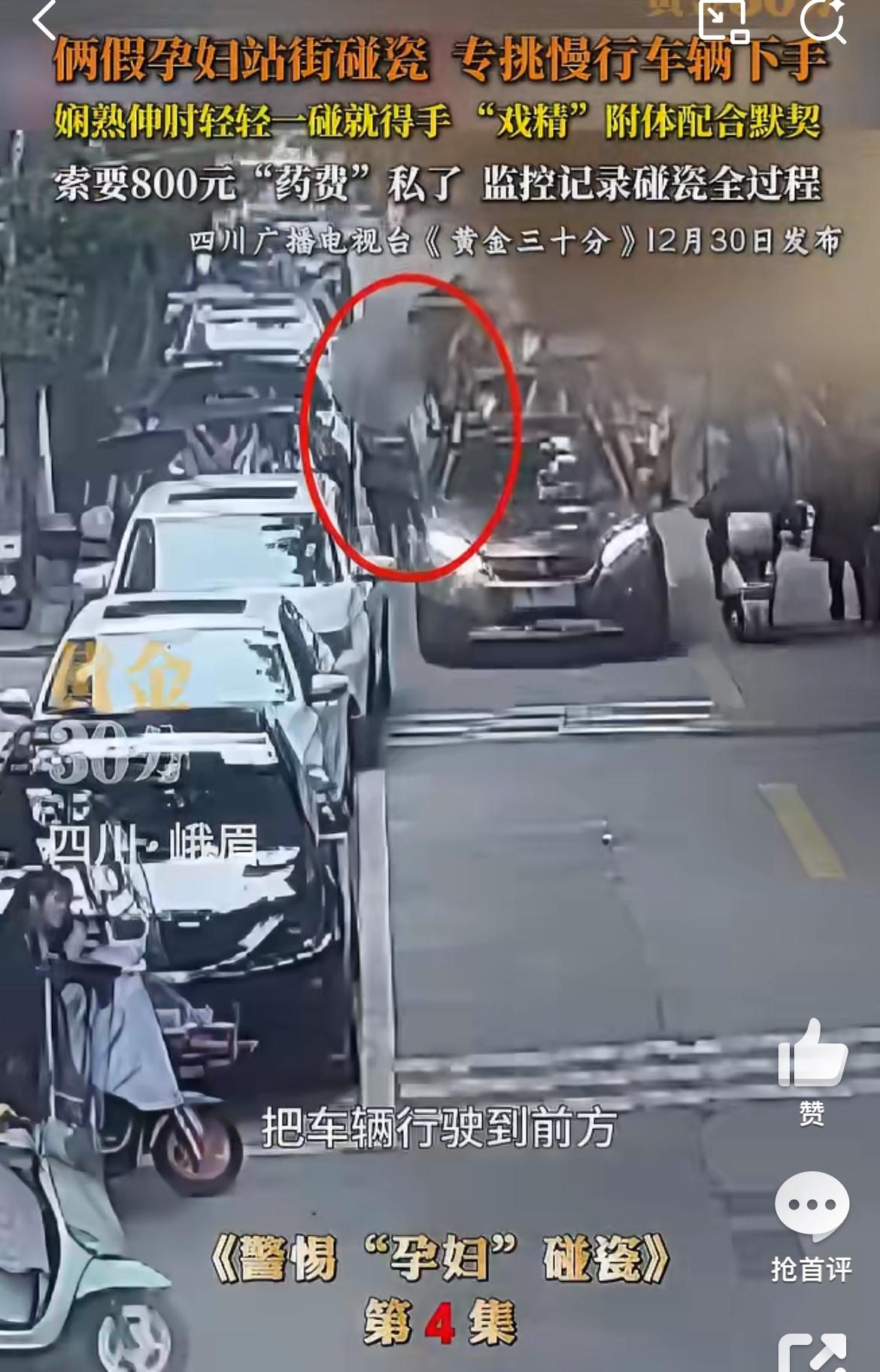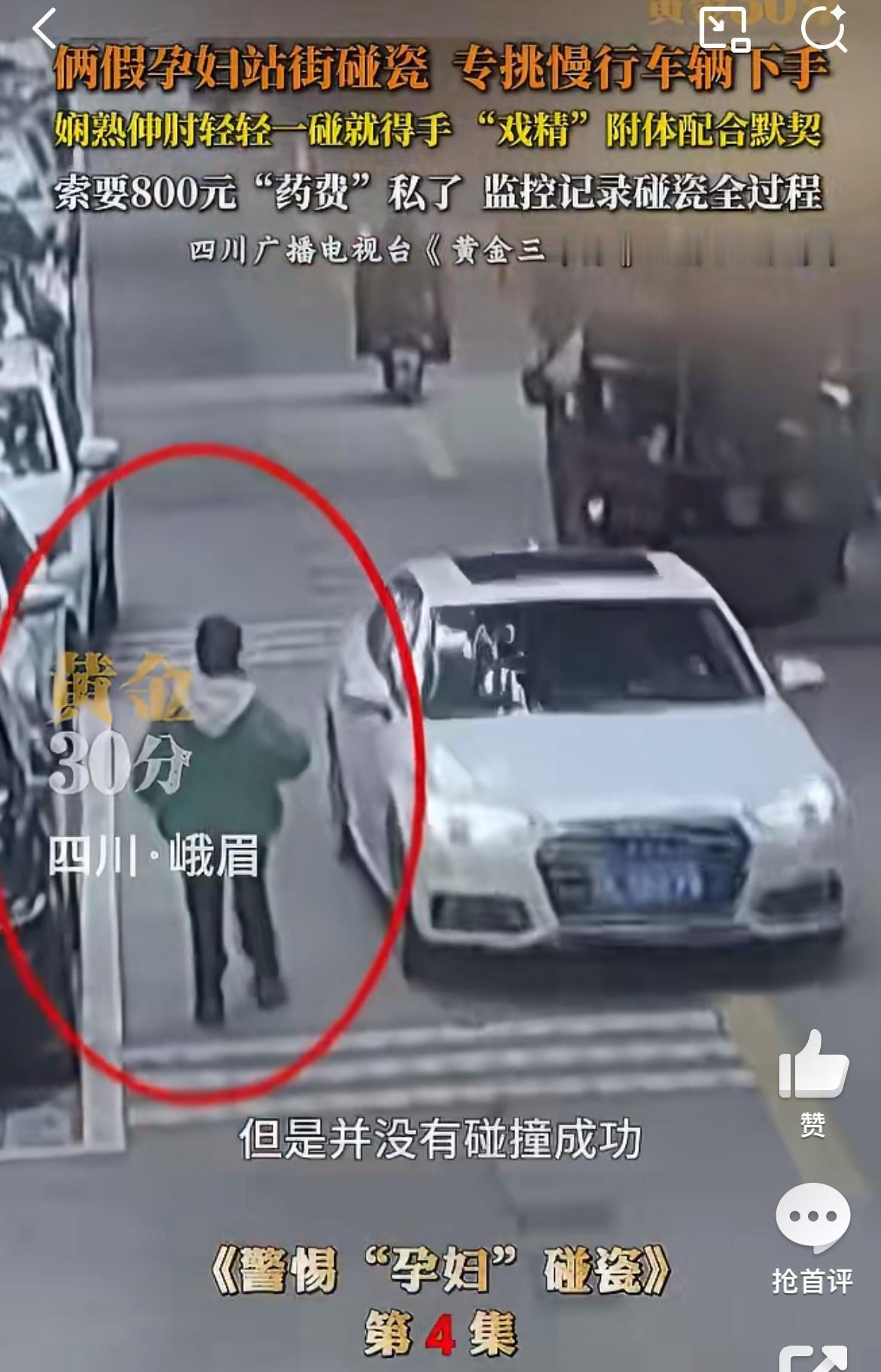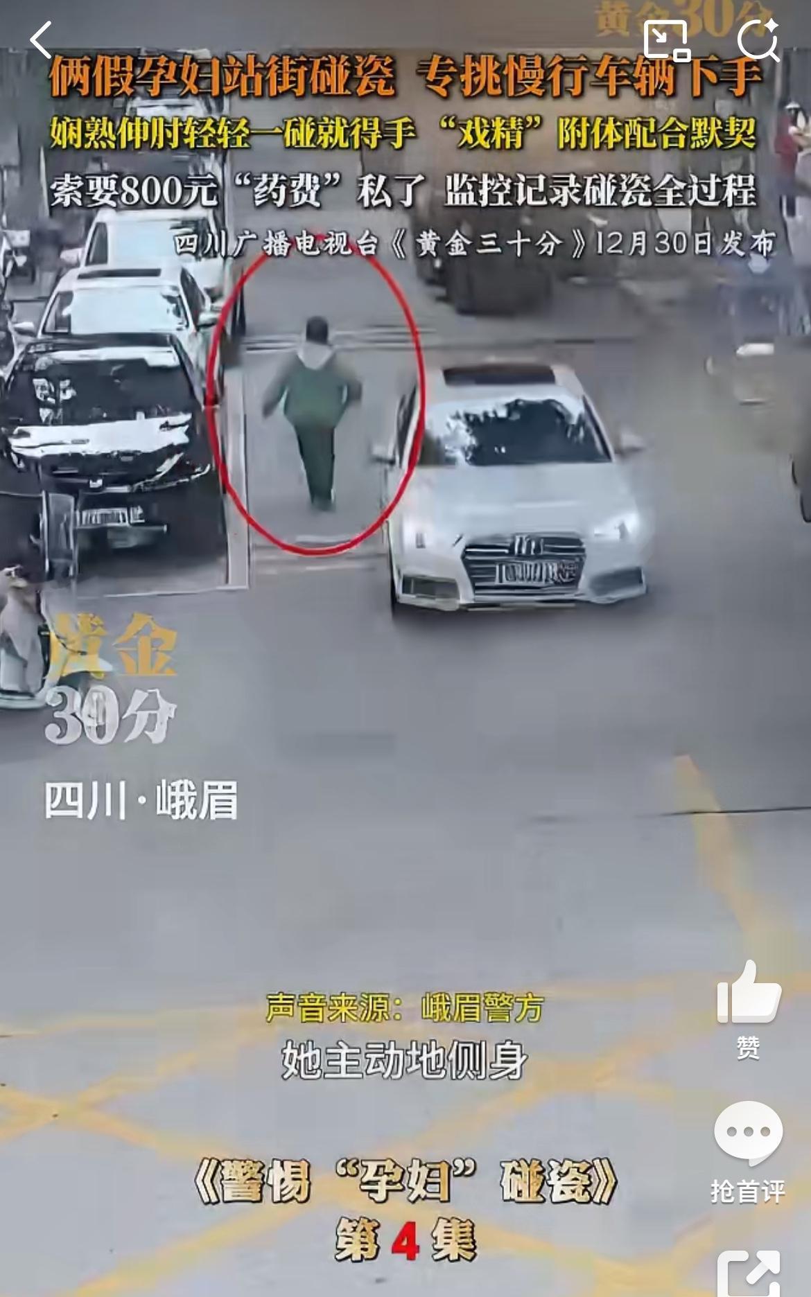 四川峨眉两孕妇马路边碰瓷,演技不咋行,但是碰瓷的车主纷纷中招。他们两个逆行,等过路的车辆,神手臂过去碰瓷,在找车辆索赔。装作是孕妇,不能照CT之类的检查,药是成都买的,很贵。这些赶时间的车主不得不就范,赔钱了事。所以遇到类似交通意外,不要私了,报警解决。碰瓷纠纷 车碰瓷