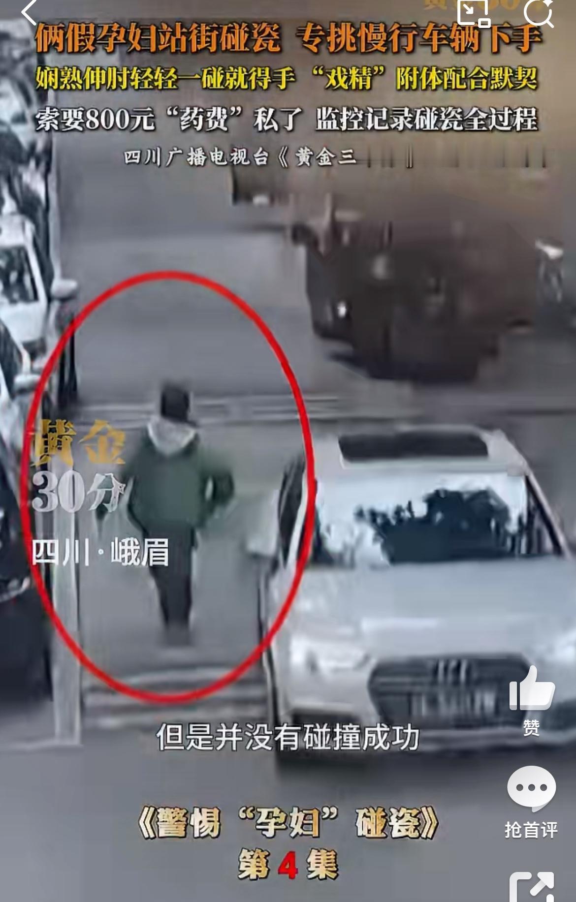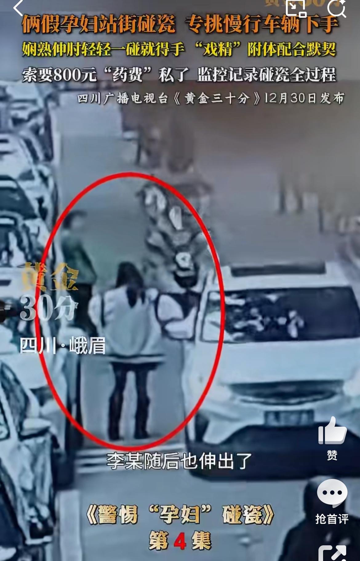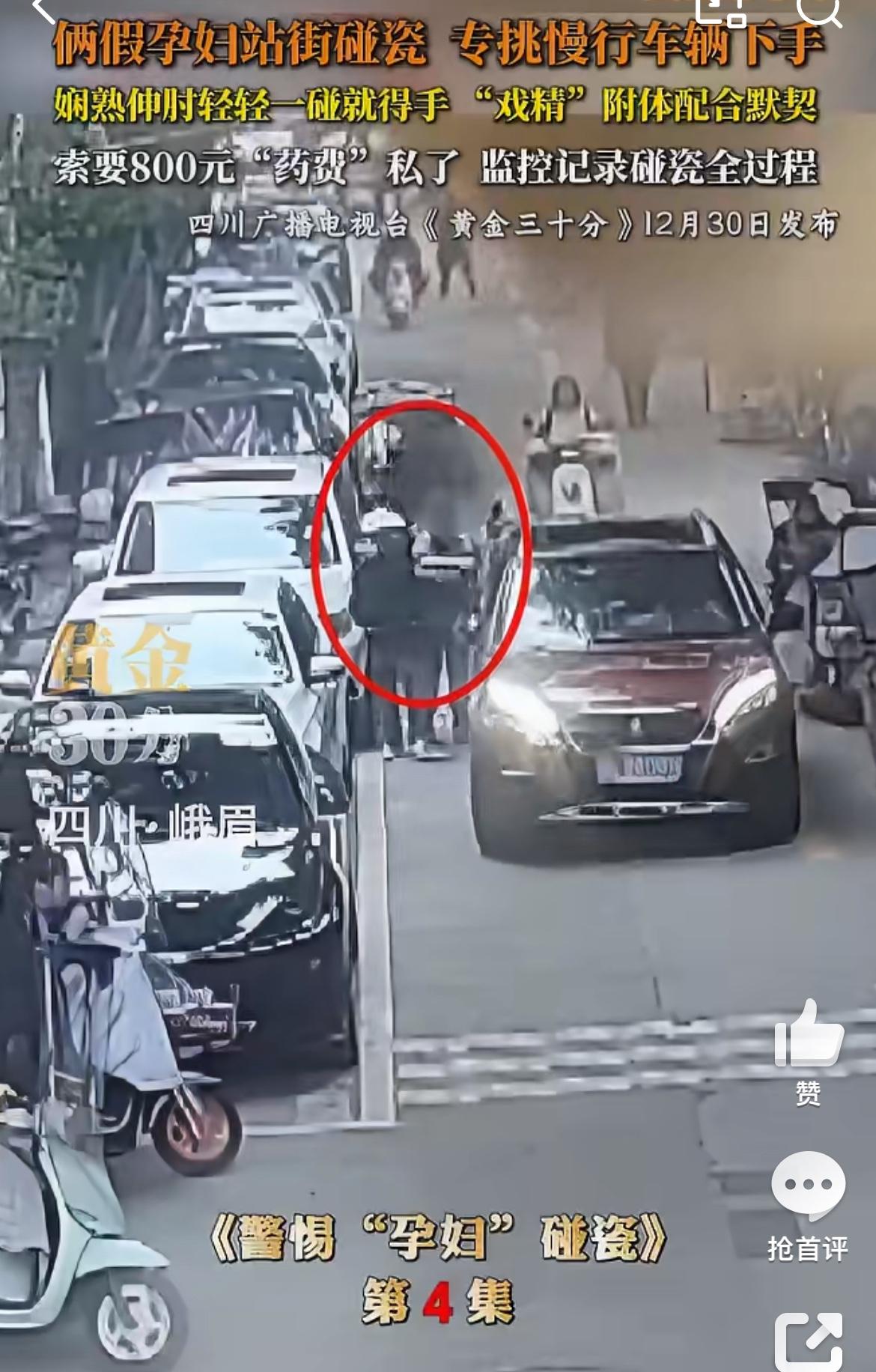 四川峨眉两孕妇马路边碰瓷,演技不咋行,但是碰瓷的车主纷纷中招。他们两个逆行,等过路的车辆,神手臂过去碰瓷,在找车辆索赔。装作是孕妇,不能照CT之类的检查,药是成都买的,很贵。这些赶时间的车主不得不就范,赔钱了事。所以遇到类似交通意外,不要私了,报警解决。碰瓷纠纷 车碰瓷