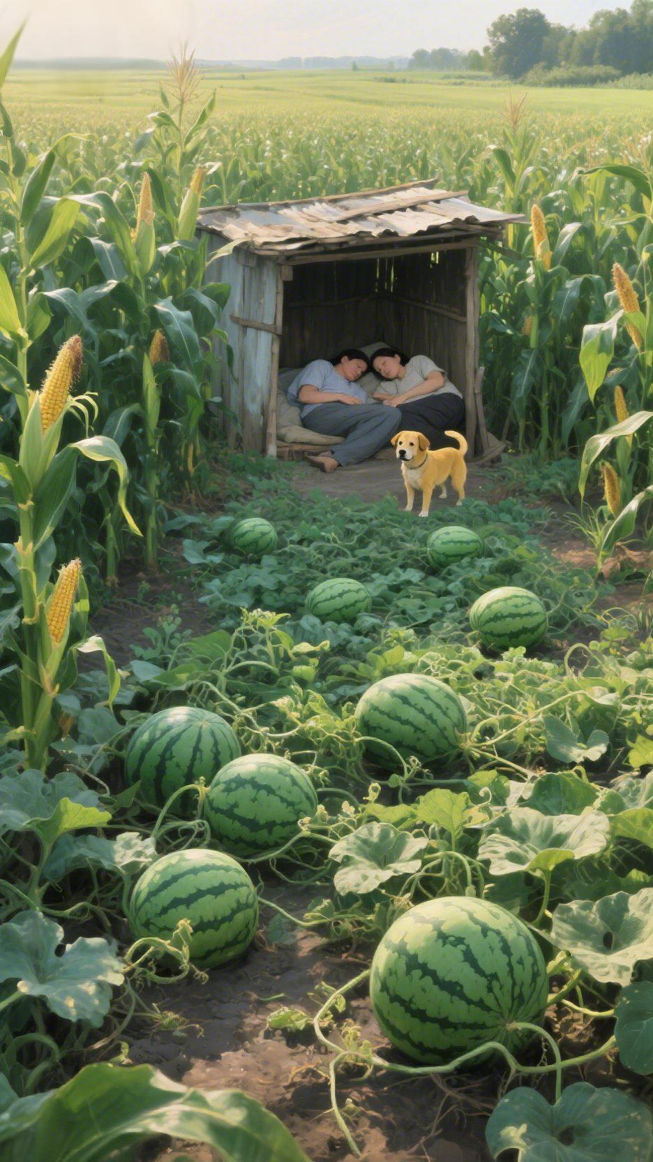 田棚里的夏日光 暑气浸在玉米叶的褶皱里时,田棚成了最软的凉榻。两个人挨靠着睡,呼吸裹着麦香轻晃,黄狗蹲在棚口,耳朵支着听风里的虫鸣。 西瓜在藤蔓上滚着,绿纹裹着日头的暖,连叶片的影子都懒懒散散。风掠过玉米秆,簌簌声裹着夏的松弛——像把整个田野的热意,都揉成了棚里的浅眠。 原来最踏实的夏天从不是冰饮与空调,是这田垄间的小憩,让日头都慢下来,落在棚顶的旧瓦上,成了最鲜活的烟火气。 田野夏眠记 烟火松弛感