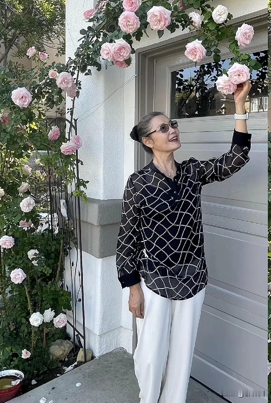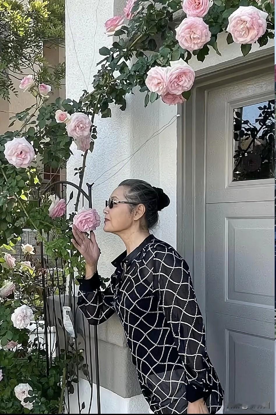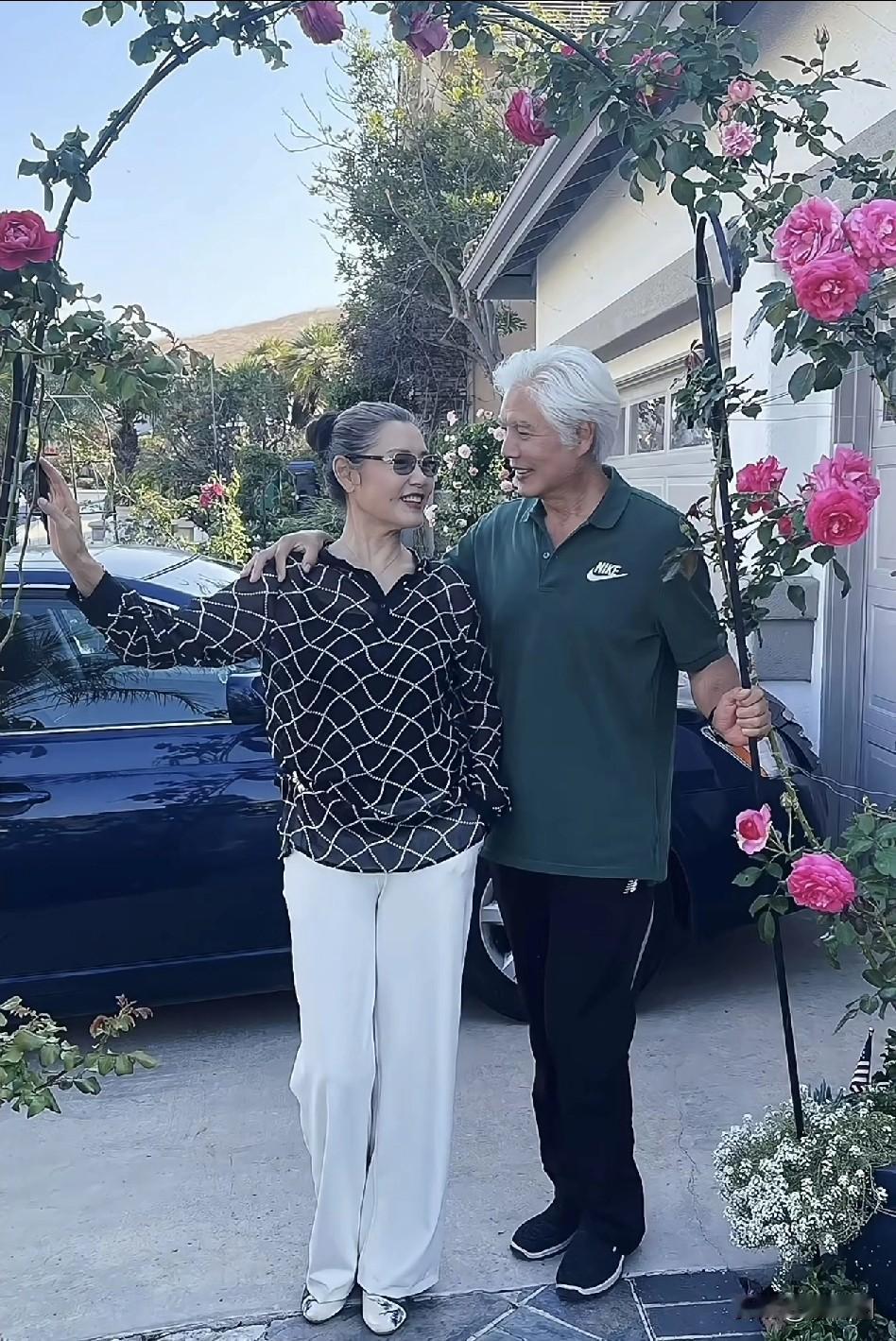 姜黎黎夫妇定居国外,豪宅门前合影。整个人优雅的老去,一点都不在乎自己的容貌。