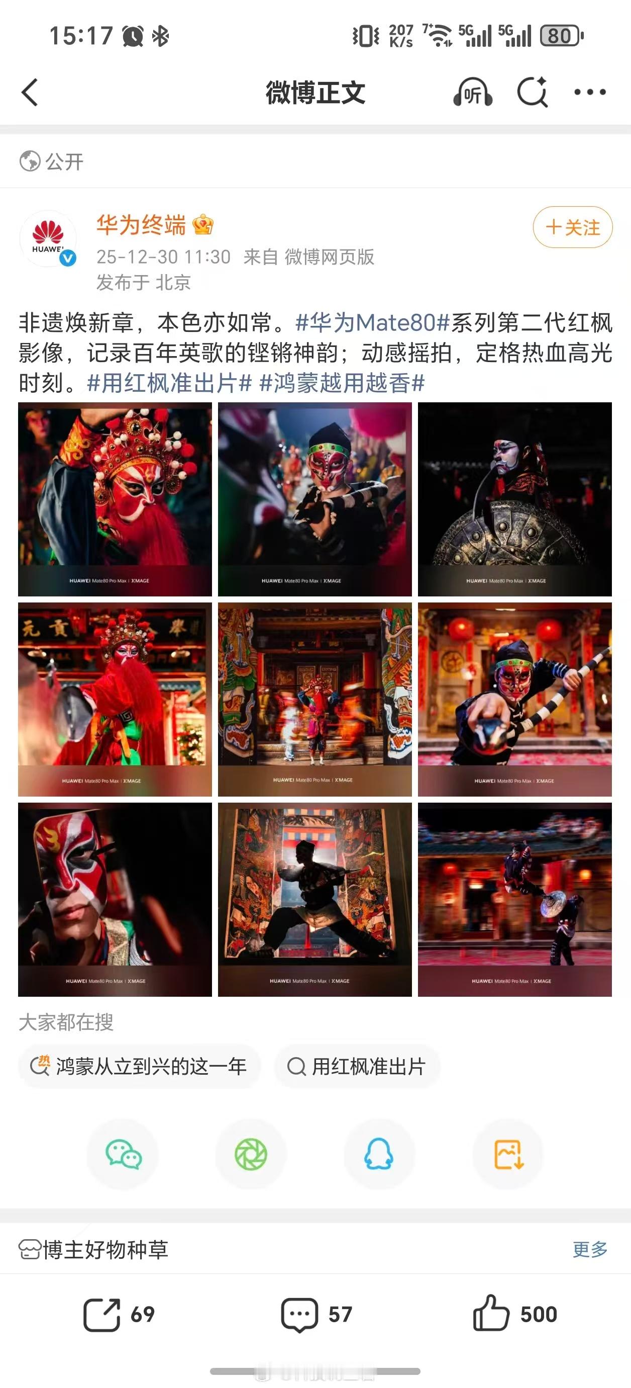 Mate80把非遗英歌拍出新花样 谁还没刷到华为和非遗英歌舞的梦幻联动!这波跨界真的戳中年轻人的心巴,老祖宗传了几百年的宝藏艺术,被Mate 80拍得又燃又鲜活!Mate 80的全焦段实力真的很强,潜望长焦拉近英雄脸谱的坚毅神情,连高速旋转的槌花和跳跃的蜈蚣步都很稳,动态模糊不存在的!花絮视频里英歌队员的脸谱纹路更是清晰,彩色木棒敲击的瞬间没有一丝拖影,连服饰上的刺绣细节都根根分明,队列变换更是拍得气势拉满,就像站在现场看表演一样!英歌舞的阳刚豪气和少年传承人的热血感被狠狠拿捏了。华为这波不仅让“北有安塞腰鼓,南有普宁英歌”的非遗被更多人看见,更证明了好的影像能让传统文化活起来!刷到视频的网友都在求壁纸,这才是非遗焕新的正确打开方式~