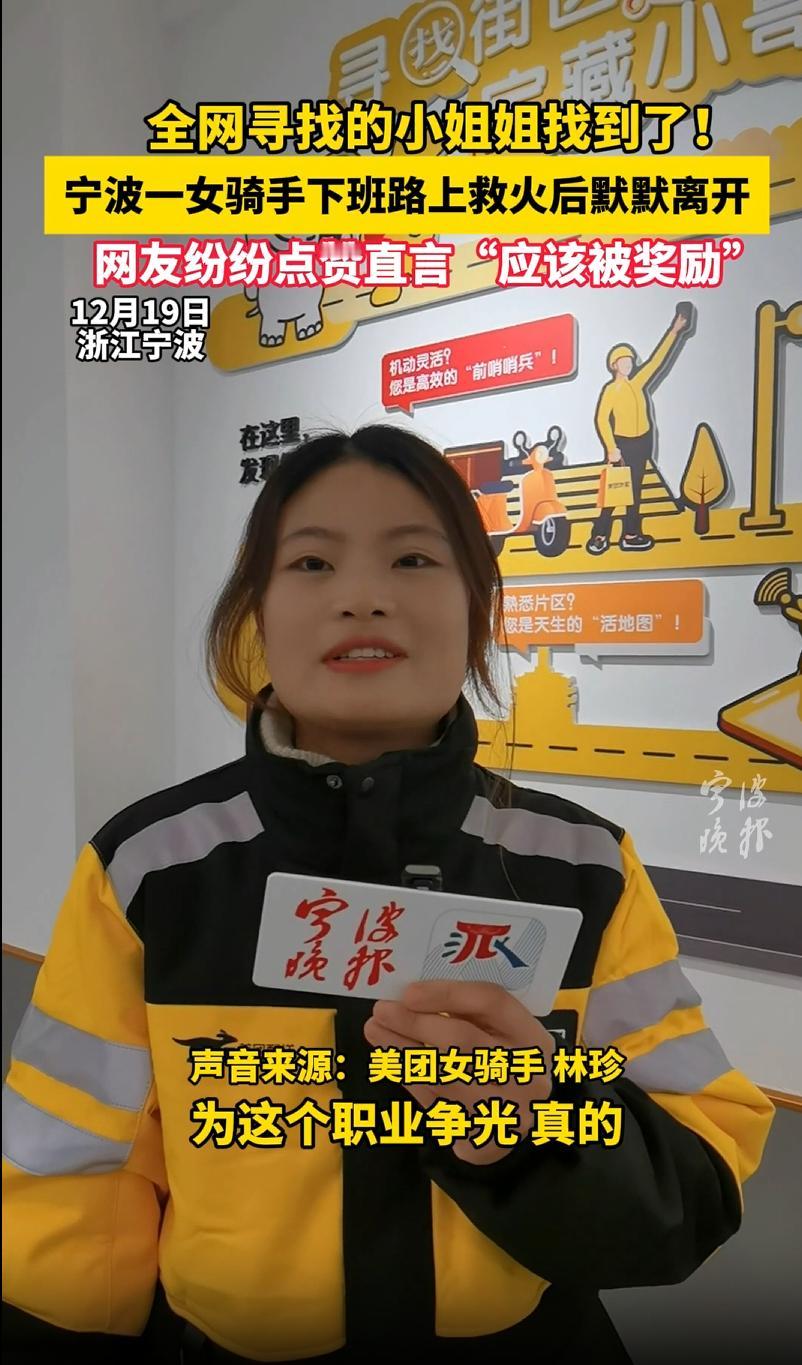 电瓶车突然起火,火光一瞬把人群推远。 我正本能往后退时,一位女骑手停下车,转身就去找灭火器,又折返把火压住。 火焰被一点点打散,她又跑了一趟,抱来第二个灭火器,十来分钟后彻底扑灭,然后抹了把汗,默默离开。 这几天,大家在找她。 视频在网上传开,我也跟着刷到了。 后来终于知道,她叫林珍,是美团的外卖骑手。 她的身形并不高大,动作却干净利落,现场混乱的情绪也被她的冷静稳住。 那晚很多人害怕,我也是,但总有人会在关键时刻往前一步。 12月19日,在刚启用的浙江首家骑手之家中心店,美团为她授予先锋骑手荣誉称号,送上锦旗和奖励金。 作为路人,我格外认同这份及时的看见与兑现:一个人把火灭掉,一个平台把善意放在台上,城市的温度就多了一层。 我们需要这样的彼此托举。 向林珍致敬,也为美团点个赞。 愿更多善举被看见,愿每一次勇敢都能被认真回应。