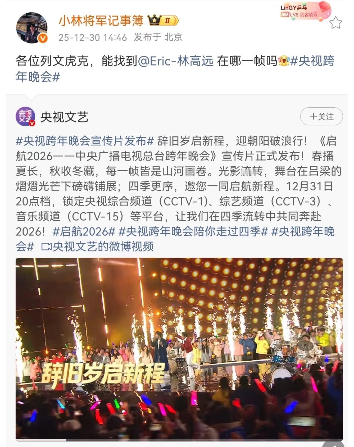央视文艺:央视跨年晚会宣传片——猜一猜林高远和王祖蓝在一起合唱什么歌! 12月30日,央视跨年晚会宣传片 出现林高远与王祖蓝的合唱, 太开心了😃, 世界冠军林高远将 出现在今年的央视跨年晚会上, 还是梦幻联动, 跨界歌王林高远会唱什么歌曲呢? 12月21日晚八点, 在央视频,央视新闻, 央视网都可以观看, 期待林高远的倾情演唱! 红衣服的是王祖蓝, 蓝衣服高远, 我个人认为演唱粤语歌曲的 概率比较大! 盲猜“海阔天空”! 祝大家2026生活,工作 更有动力!