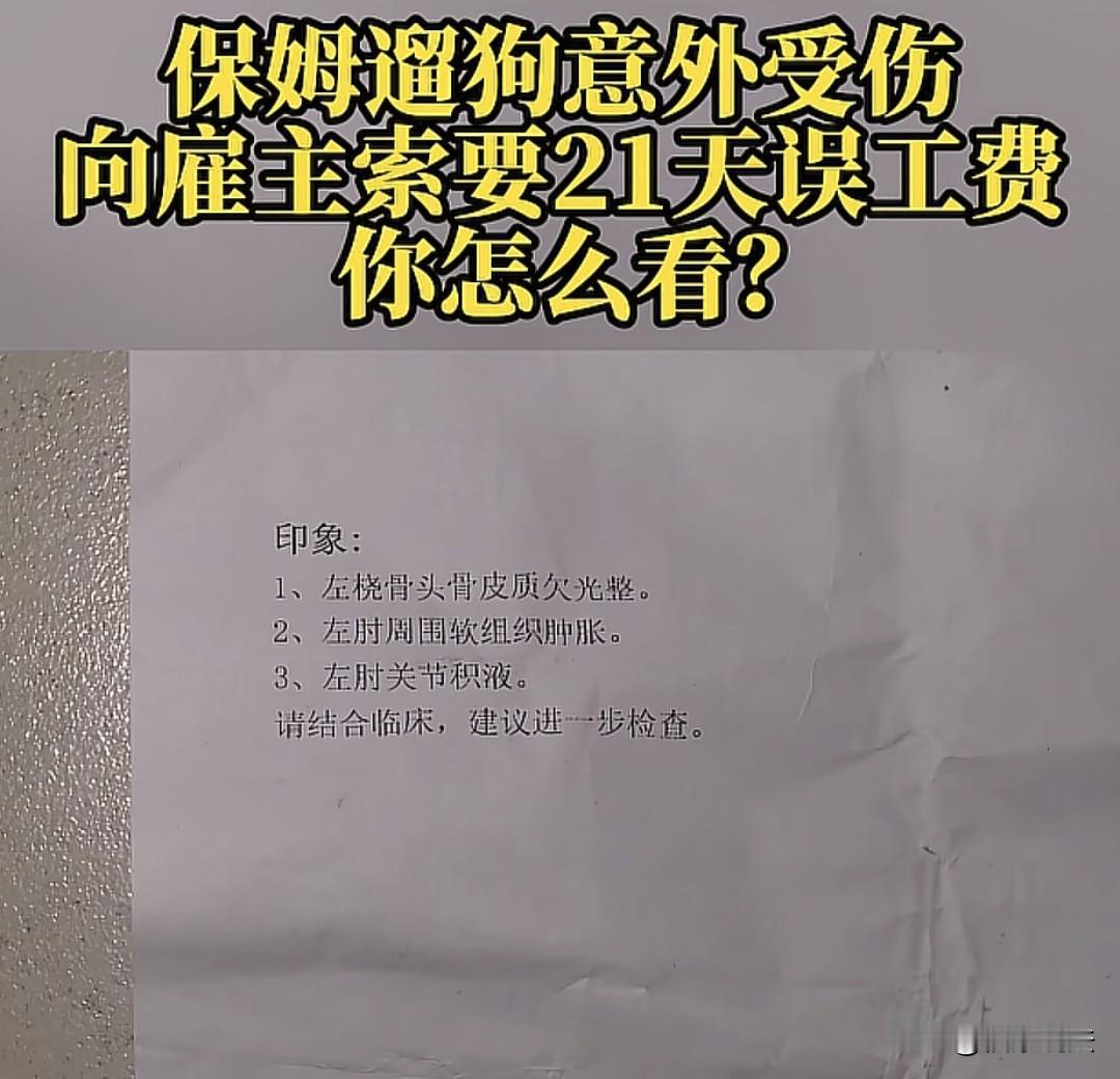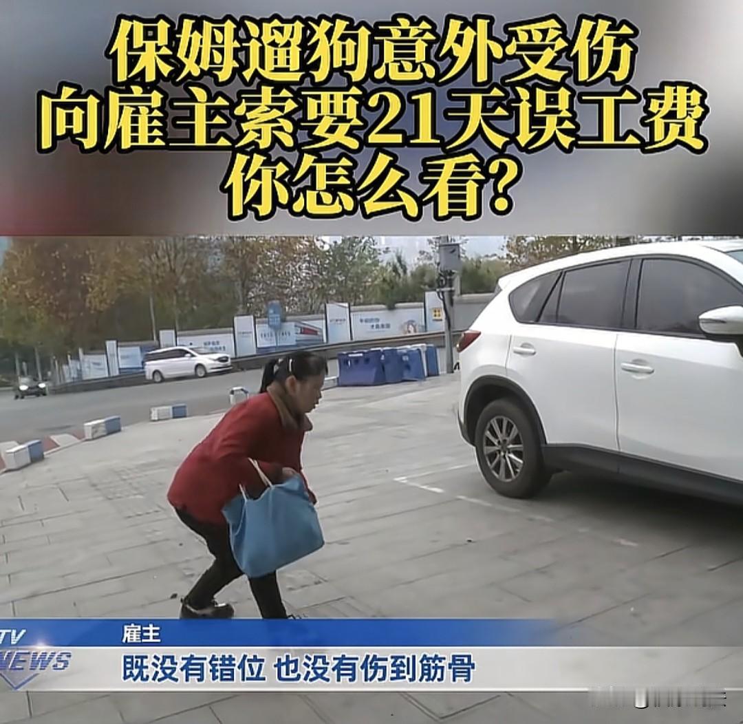 “得寸又进尺?”重庆,52岁的保姆给雇主家,遛不到4斤重的小狗时,不慎摔倒,胳膊肘受伤,医院诊断软组织肿胀,建议她修养21天,雇主给她出了医药费,可保姆不干,跟雇主索要21天误工费,雇主委屈的说:她照了3次CT,都没发现伤筋动骨,检查、药费都是我出,不可能再给她误工费,她可以报警、起诉都可以… 52岁的黄女士通过家政工公司介绍,到了一家做了住家保姆,一个月工资5000块钱。 据黄女士讲述:12月2号这天,黄女士牵着雇主家的小狗出门遛狗时,路上停着的车突然启动,轰鸣声给小狗吓到了,它拔腿就跑。 黄女士也没牵住,她一看狗跑了,心里不由得慌了神,这万一抓不回来,怎么跟雇主交代。 于是,她顾不上别的,赶紧跑着追了上去,眼看着追上小狗,她情急之下用左脚去踩小狗的牵引绳,结果绳子一滑,她整个人摔了下去…… 摔倒在地后,黄女士只觉得左胳膊肘肿了起来,钻心的痛。 之后,雇主陪着黄女士到了医院看伤,拍了CT后,医院诊断,黄女士的左胳膊肘软组织肿胀,给她开了一些治疗跌打损伤的药。 黄女士觉得自己伤的严重,就问医生:多久能好啊? 医生告诉她,至少要21天,也就是三周才能好,让她好好休息。 所以,黄女士觉得自己是遛狗摔伤了,医生让自己休养21天,那这21天的误工费雇主得给自己,不可能受伤了,就这样过去了,所以,她说误工费雇主得给自己解决了。 因为这事,家政公司对双方进行了协商,可结果让人有些无奈。 家政公司负责人表示,公司和黄女士签订的《居间服务合同》推荐成功后,他们会收个居间服务费。 但是,保姆黄女士却没有和雇主签订服务合同。 家政公司负责人说,黄女士回去家里买药的这些药钱,都是雇主给她出的。 然而,在调解时,也和黄女士商量过,说多给她两天工资,可是黄女士不同意。 之后,负责人又去和雇主协商,说多给黄女士500块钱,可黄女士还是不同意。 黄女士坚持要求雇主赔偿21天误工费,甚至找了记者帮忙。 记者联系上雇主核实情况。 雇主很无奈的讲了经过,她说当时保姆黄女士遛狗回来后说她受了伤,但是到底怎么受伤的雇主也不清楚。 对于医生建议黄女士休养21天这件事,雇主也不认可。 雇主说,医生当时这么说,也是对黄女士的一种同情。那黄女士光CT就照了三次,都没有发现有伤筋动骨的情况,也没错位,更没伤到筋骨,就是软组织受伤。 而且,雇主说她检查费、药费都是她出的,所以,对于误工费她不认可,如果黄女士不同意可以报警,或者起诉都可以。 有人说,这女人有点得寸进尺,自断自己的生路,以后谁还敢聘用她,如果她是在自己家里摔了,可能医院都不会去,照常干活做事,真是想钱想疯了。 这是你自己受伤的,又不是雇主让你受伤的,你自己受伤了还导致人家家里没有保姆。所有的责任就在保姆身上。 也有人说,最坏的都是人性,现在有句话叫适可而止。鼠目寸光,把自己的后路给堵死了,再也找不到这么好工作,回家还遭儿媳妇白眼。 医生其实只是口头说建议休息,他晓得是工伤,但凡你让医生正儿八经开个病假条证明休息二十一天,他根本不可能开那么多天。 还有人开玩笑说,四斤重的大狗 确实拉力太大啦,可以把人拉飞起来,狗要是能说话:劳资才不背锅! 这保姆也可以,在没有骨折情况下,照了三次CT,真是不把身体当回事了。 那么,这事儿的责任到底该不该由雇主承担呢? 而雇主在承担了医药费后,还需要承担黄女士21天的误工费吗? 最后,家政公司表示会组织黄女士和雇主再次协商,如果还达不成一致,只有让黄女士走法律途径了。 从法律角度来说,虽然黄女士没有和雇主签订服务合同,但实际已经形成了劳务关系,黄女士是在为雇主提供遛狗这一劳务过程中受伤的。 在提供劳务过程中,黄女士因遛狗时受到惊吓而摔倒受伤,这属于因劳务受到损害的情形。 《民法典》第1192条规定:个人之间形成劳务关系,提供劳务一方因劳务受到损害的,根据双方各自的过错承担相应的责任。 也就是说,雇主和黄女士应根据各自的过错承担责任。 在此事件中,黄女士摔倒受伤主要是由于车突然启动吓到小狗这一意外因素导致,但黄女士作为成年人,在追狗过程中也应尽到一定的安全注意义务。 若雇主在黄女士受伤过程中不存在过错,则雇主不需承担全部责任。 关于误工费,根据《最高人民法院关于审理人身损害赔偿案件适用法律若干问题的解释》,误工费应根据受害人的误工时间和收入状况确定。 黄女士月工资5000元,且医生建议修养21天,因此她有权要求雇主赔偿这21天的误工费。 但前提是,雇主存在过错或按公平原则需分担部分损失。 另外,如果家政公司在介绍过程中,如实向双方报告了与订立合同有关的重要事项,不存在故意隐瞒或提供虚假情况损害双方利益的行为,那么家政公司在此次纠纷中一般不需要承担法律责任。
