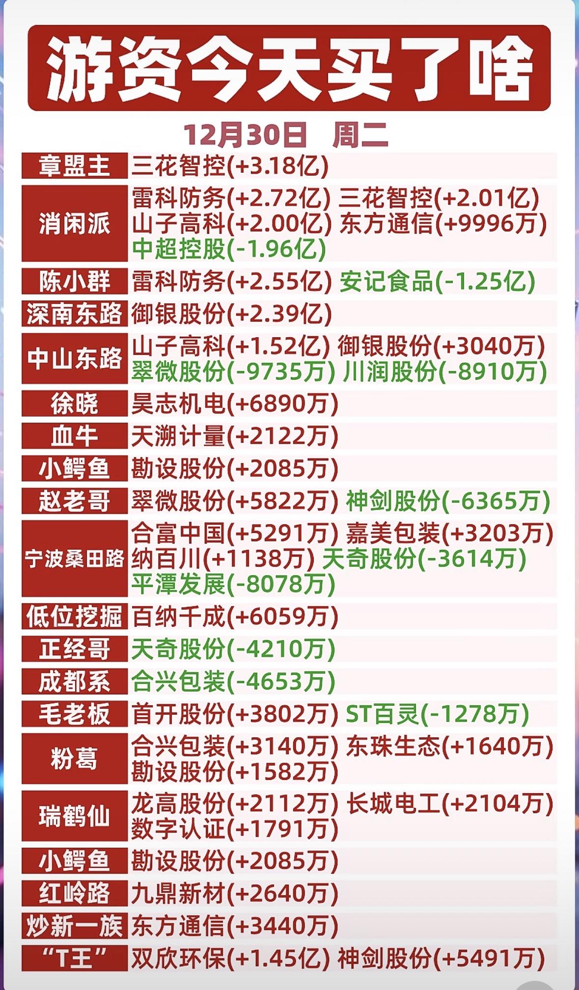 12月30日今日游资动向:谁在买入,谁在卖出? 游资动向:章盟主重仓三花雷科, 陈小群押注安记,小鳄鱼抄底九鼎, 赵老哥加码翠微, 各路资金博弈激烈。