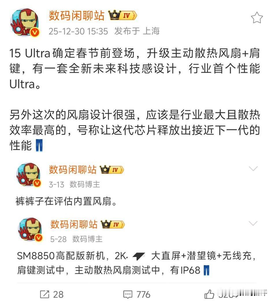 iQOO15Ultra春节前发布!上最强风扇[奸笑]把骁龙8Elite Gen5处理器性能压榨完,还有游戏肩键,算是游戏神机了,按理机身尺寸也会更大一点吧[思考]拉到6.9英寸机身,也更好堆散热,如果电池容量再大一点就更好了,iQOO15Ultra起售价会不会拉到4999起?冲击高端