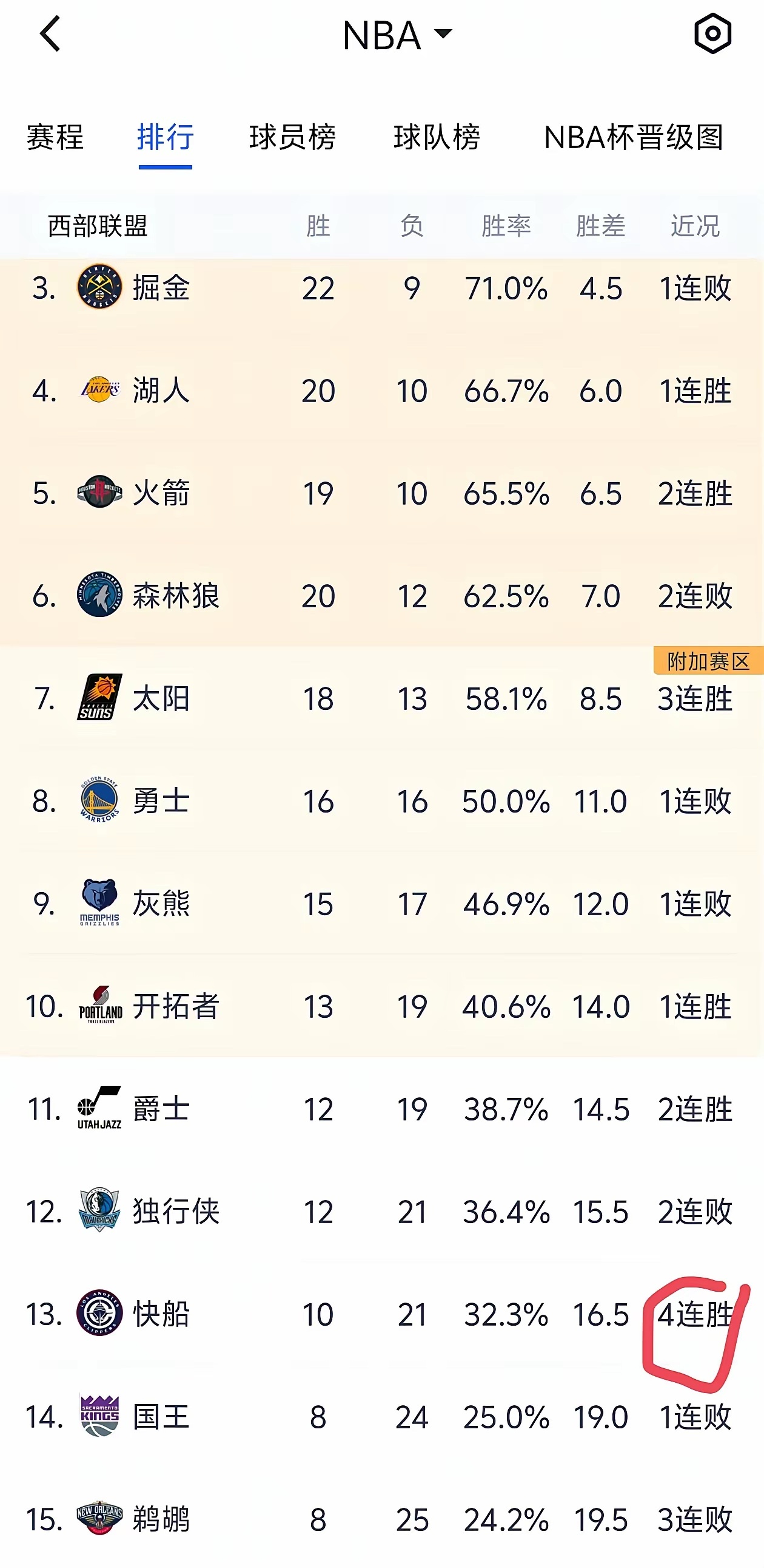 快船四连胜了,从西部垫底,到西部附加赛了。说不定真有机会冲击季后赛,毕竟球队星光璀璨。还有一件事,快船要是状元签,早就交易给雷霆了,所以快船不垫底皆大欢喜