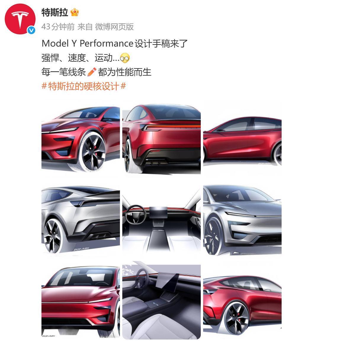 特斯拉Model Y Performance设计手稿来了!这波“战斗范儿”直接拉满![吃瓜群众] 新车外观更激进,专属尾翼+运动包围是最大亮点。 ✅ 专属碳纤维固定式尾翼,性能车标识拉满! ✅ 全新运动包围,前脸导流孔加大+雾黑处理,战斗气息十足。 ✅ 大尺寸轮毂+红色刹车卡钳,低趴姿态更显性能范儿。 ✅ 车尾扩散器加持,空气动力学UP。 美国早在今年9月上市,起售价5.75万美元(约合人民币40万出头) 特斯拉这波操作,是不是在给国内消费者提前“画饼”? 大家觉得这设计够不够味儿?期待国内上市吗?